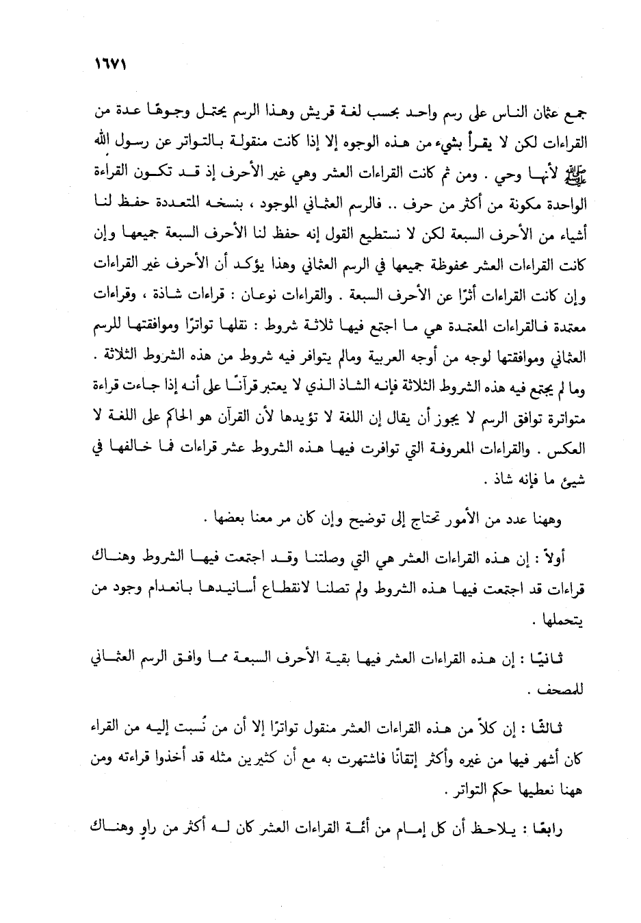 جمع عثمان الناس على رسم واحد بحسب لغة قريش وهذا الرسم يحتمل وجوهاً عدة من القراءات لكن لا يقرأ بشيء من هذه الوجوه إلا إذا كانت منقولة بالتواتر عن رسول الله صلى الله عليه وسلم لأنها وحي. ومن ثم كانت القراءات العشر وهي غير الأحرف إذ قد تكون القراءة الواحدة مكونة من أكثر من حرف ... فالرسم العثماني الموجود، بنسخه المتعددة حفظ لنا أشياء من الأحرف السبعة لكن لا نستطيع القول إنه حفظ لنا الأحرف السبعة جميعها وإن كانت القراءات العشر محفوظة جميعها في الرسم العثماني وهذا يؤكد أن الأحرف غير القراءات وإن كانت القراءات أثراً عن الأحرف السبعة. والقراءات نوعان: قراءات شاذة، وقراءات معتمدة فالقراءات المعتمدة هي ما اجتمع فيها ثلاثة شروط: نقلها تواتراً وموافقتها للرسم العثماني وموافقتها لوجه من أوجه العربية وما لمي توافر فيه شروط من هذه الشروط الثلاثة. وما لم يجتمع فيه هذه الشروط الثلاثة فإنه الشاذ الذي لا يعتبر قرآناً على أنه إذا جاءت قراءة متواترة توافق الرسم لا يجوز أن يقال إن اللغة لا تؤيدها لأن القرآن هو الحاكم على اللغة لا العكس. والقراءات المعروفة التي توافرت فيها هذه الشروط عشر قراءات فما خالفها في شيء ما فإنه شاذ.