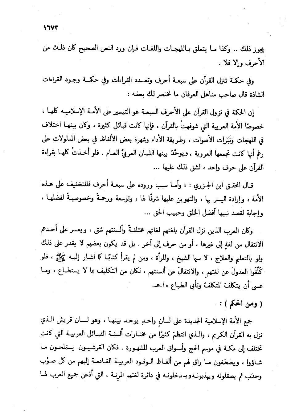 إن الحكمة في نزول القرآن على الأحرف السبعة هو التيسير على الأمة الإسلامية كلها، خصوصاً الأمة العربية التي شوفهتْ بالقرآن، فإن كانت قبائل كثيرة، وكان بينها اختلاف في اللهجات ونبرات الأصوات، وطريقة الأداء وشهرة بعض الألفاظ في بعض المدلولات على رغم أنها كانت تجمعها العروبة، ويوحِّدُ بينها اللسان العربيُّ العام. فلو أخذتْ كلها بقراءة القرآن على حرف واحد، لشق ذلك عليها ...
