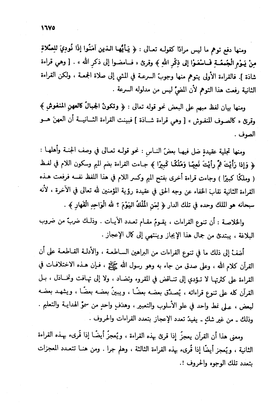 ومعنى هذا أن القرآن يعجزُ إذا قرئ بهذه القراءة، ويُعجزُ أيضاً إذا قُرئ بهذه القراءة الثانية، ويُعجز أيضاً إذا قُريء بهذه القراءة الثالثة، وهلم جرا. ومن هنا تتعدد المعجزات بتعدد تلك الووه والحروف!.
