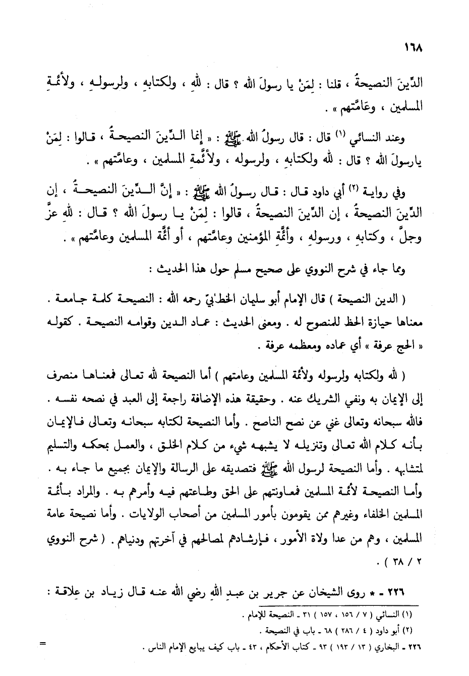الدِّينَ النصيحةُ، قلنا: لِمَنْ يا رسول الله؟ قال: لله، ولكتابه، ولرسوله، ولأئمة المسلمين، وعامتهم".