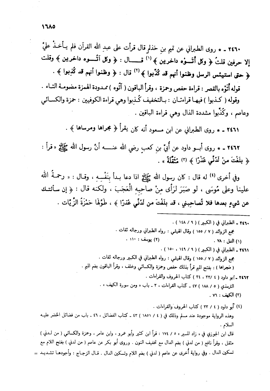 2460 - * روى الطبراني عن تميم بن حَذلمٍ قال قرأت على عبد الله القرآن فلم يأخذ عليَّ إلا حرفين قلتُ {وَكُلٌّ أَتَوْهُ دَاخِرِينَ} (1) قال: {وكل آتُوه داخرين} وقلت {حَتَّى إِذَا اسْتَيْأَسَ الرُّسُلُ وَظَنُّوا أَنَّهُمْ قَدْ كُذِّبوا} (2) قال: {وَظَنُّوا أَنَّهُمْ قَدْ كُذِبُوا}.