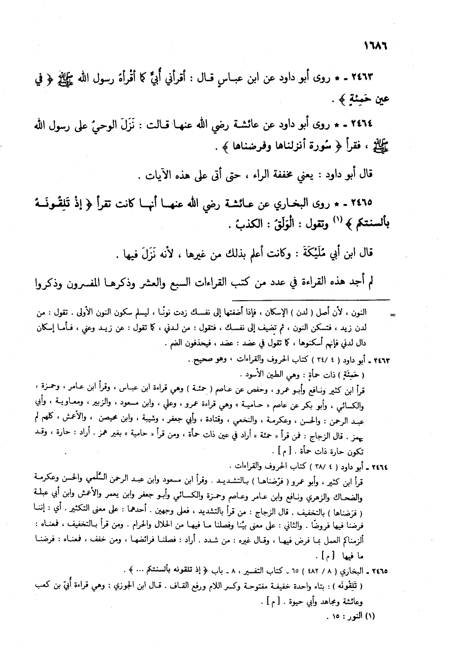 2465 - * روى البخاري عن عائشة رضي الله عنها أنها كانت تقرأ {إِذْ تَلَقَّوْنَهُ بِأَلْسِنَتِكُمْ} (1) وتقول: الوَلَقُ: الكذبُ.