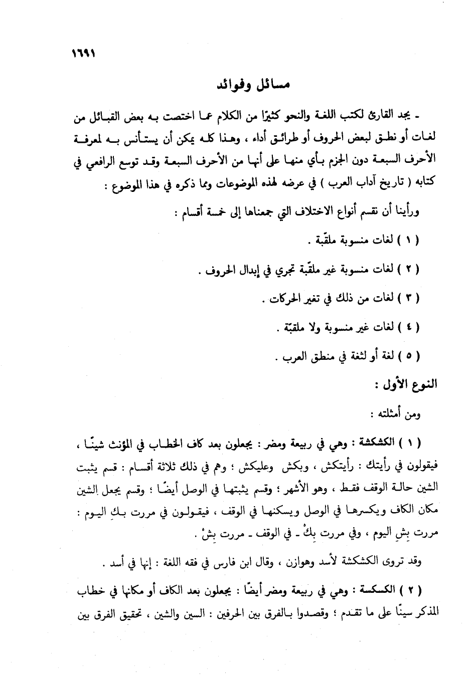 (1) الكشكشة: وهي في ربيعة ومضر: يجعلون بعد كاف الخطاب في المؤنث شيناً، فيقولون في رأيتك: رأيتكش، وبكش وعليكش؛ وهم في ذلك ثلاثة أقسام: قسم يثبت الشين حالة الوقف فقط، وهو الأشهر؛ وقسم يثبتها في الوصل أيضاً؛ وقسم يجعل الشين مكان الكاف ويكسرها في الوصل ويسكنها في الوقف، فيقولون في مررت بك اليوم: مررت بشِ اليوم، وفي مررت بِكْ- في الوقف - مررت بِشْ.