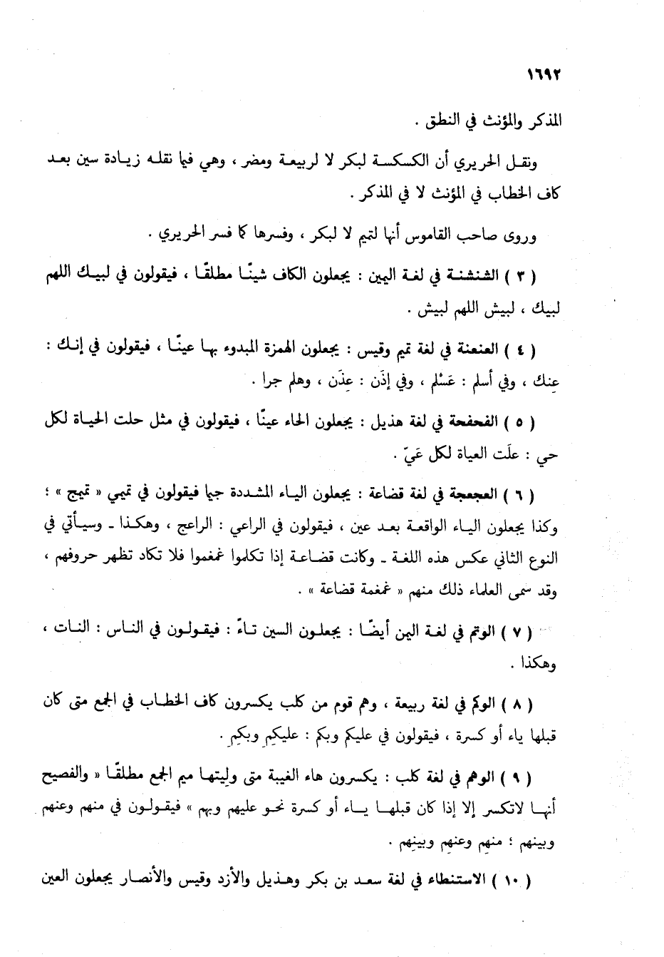 (10) الاستنطاء في لغة سعد بن بكر وهذيل والأزد وقيس والأنصار يجعلون العين