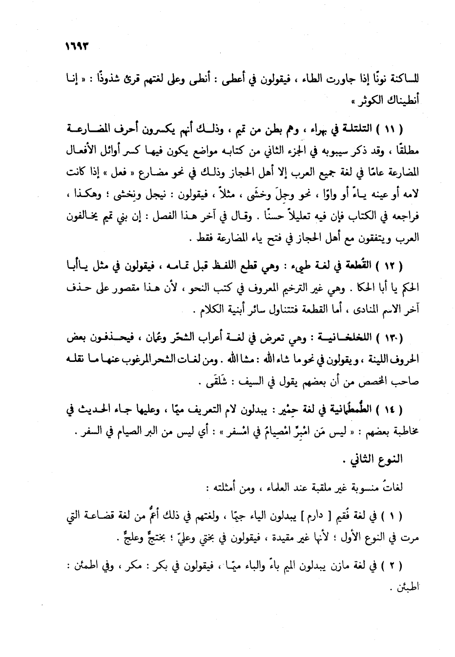 (11) التلتلة في بهراء، وهم بطن من تميم، وذلك أنهم يكسرون أحرف المضارعة مطلقاً، وقد ذكر سيبويه في الجزء الثاني من كتابه مواضع يكون فيها كسر أوائل الأفعال المضارعة عاماً في لغة جميع العرب إلا أهل الحجاز وذلك في نحو مضارع "فعل" إذا كانت لامه أو عينه ياءً أو واواً، نحو وجِلَ وخشَى، مثلاً، فيقولون: نيجل ونخشى؛ وهكذا، فراجعه في الكتاب فإن فيه تعليلاً حسناً. وقال في آخر هاذ الفصل: إن بني تميم يخالفون العرب ويتفقون مع أهل الحجاز في فتح ياء المضارعة فقط