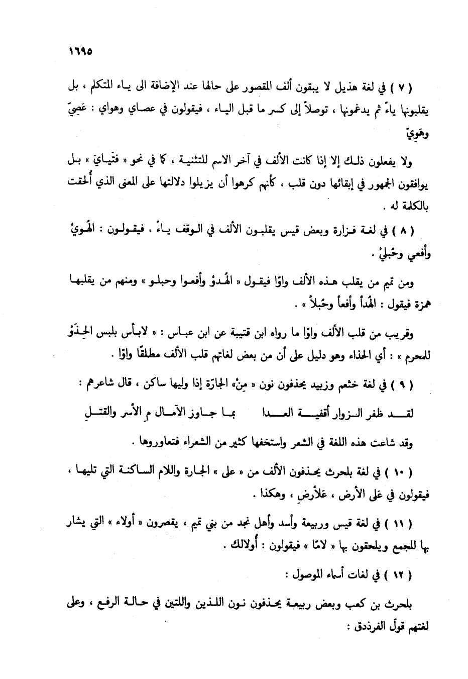 (7) في لغة هذيل لا يبقون ألف المقصور على حالها عند الإضافة إلى ياء المتكلم، بل يقلبونها ياءً ثم يدغمونها، توصلاً إلى كسر ما قبل الياء، فيقولون في عصاي وهواي: عصيّ وهويّ.