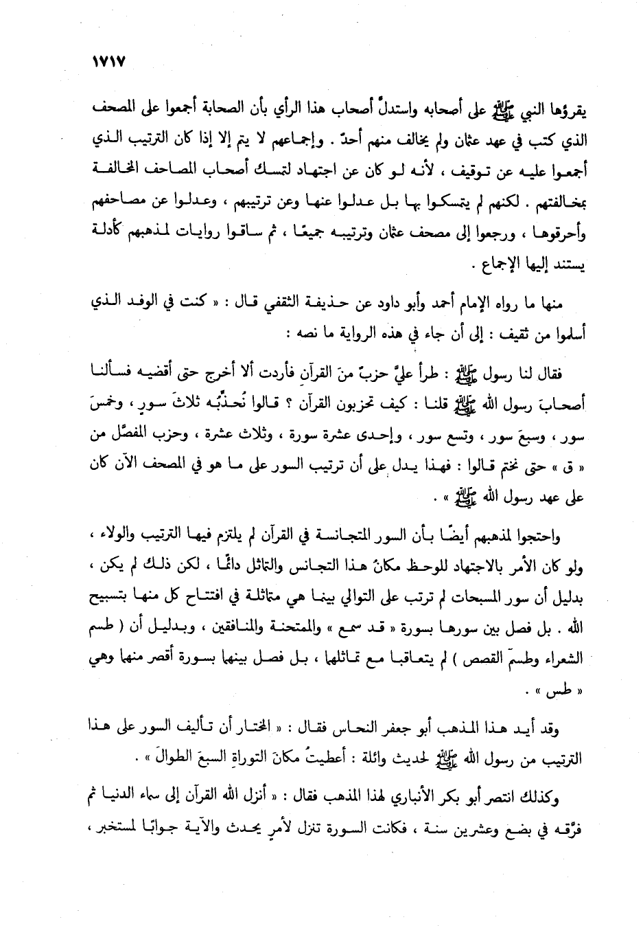 فقال لنا رسول الله صلى الله عليه وسلم: طرأ عليَّ حزبٌ من القرآنِ فأردت ألا أخرج حتى أقضيه فسألنا أصحاب رسول الله صلى الله عليه وسلم قلنا: كيف تحزبون القرآن؟ قالوا نُحذِّبُه ثلاث سورٍ، وخمس سور، وسبع سور، وتسع سور، وإحدى عشرة سورة، وثلاث عشرة، وحزب المفصَّل من "ق" حتى نختم قالوا: فهذا يدل على أن ترتيب السور على ما هو في المصحف الآن كان على عهد رسول الله صلى الله عليه وسلم.