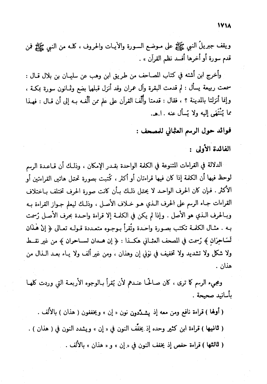 ومجيء الرسم كما ترى، كان صالحاً عندهم لأن يُقرأ بالوجوه الأربعة التي وردت كلها بأسانيد صحيحة.