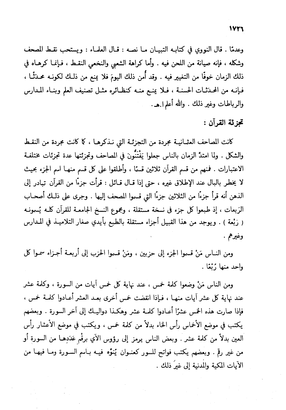 وعدماً. قال النووي في كتابه التبيان ما نصه: قال العلماء: ويستحب نقط المصحف وشكله، فإنه صيانة من اللحن فيه. وأما كراهة الشعبي والنخعي النقط، فإنما كرهاه في ذلك الزمان خوفاً من التغيير فيه. وقد أُمن ذلك اليوم فلا يمنع من ذلك لكنه محدثاً، فإنه من المحدثات الحسنة، فلا يمنع منه كنظائره مثل تصنيف العلم وبناء المدارس والرباطات وغير ذلك. والله أعلم ا. هـ.