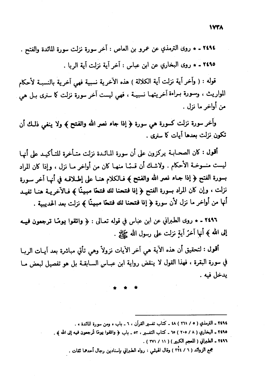 2494 - * روى الترمذي ع عمرو بن العاص: آخر سورة نزلت سورة المائدة والفتح.