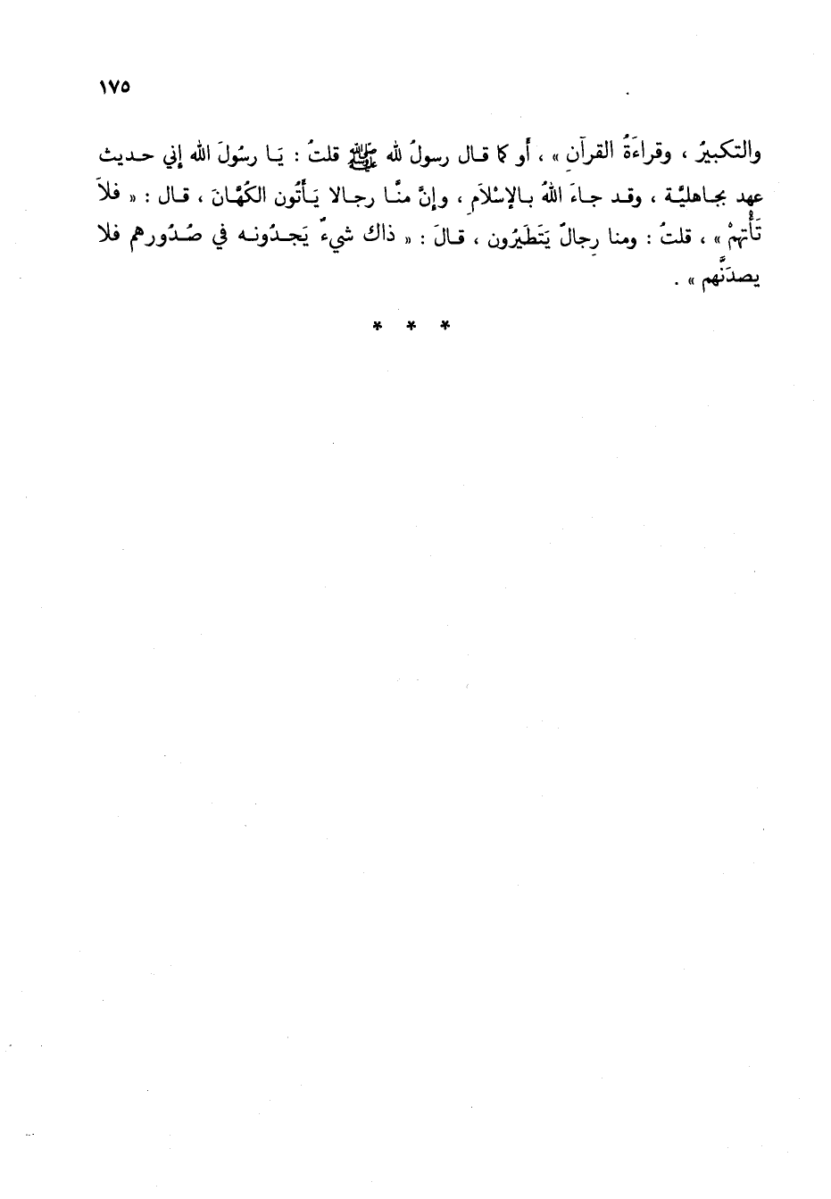 والتكبيرُ، وقراءةُ القرآن"، أو كما قال رسول الله صلى الله عليه وسلم قلت: يا رسول الله إني حديث عهد بجاهلية، وقد جاء الله بالإسلام، وإن منا رجالاً يأتون الكُهَّانَ، قال: "فلا تأتهم"، قلت: ومنا رجالٌ يتطيرون، قال: "ذاك شيء يجدونه في صدورهم فلا يصدنَّهم".