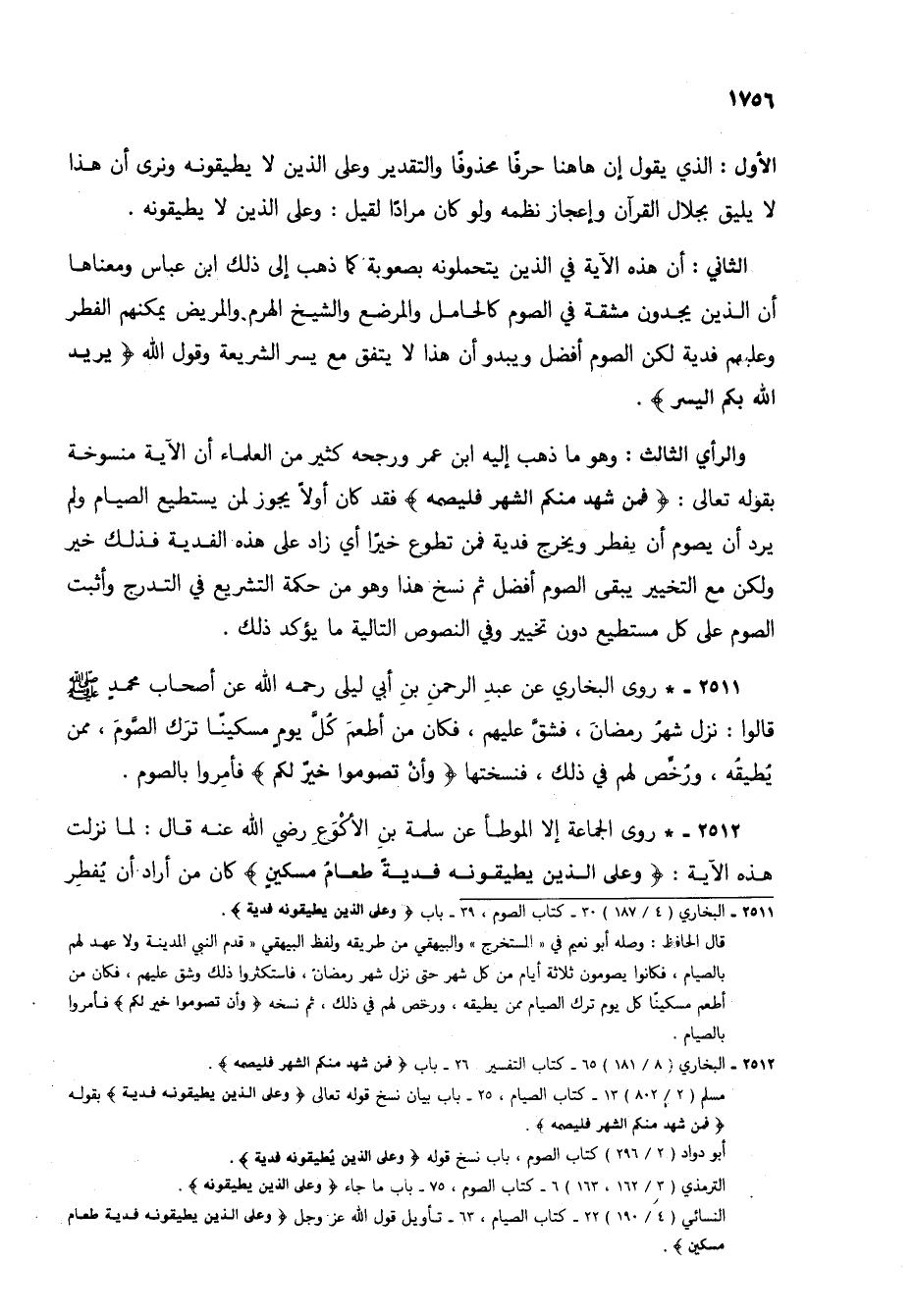 الأول: الذي يقول إن هاهنا حرفاً محذوفاً والتقدير وعلى الذين لا يطيقونه ونرى أن هذا لا يليق بجلال القرآن وإعجاز نظمه ولو كان مراداً لقيل: وعلى الذين لا يطيقونه.