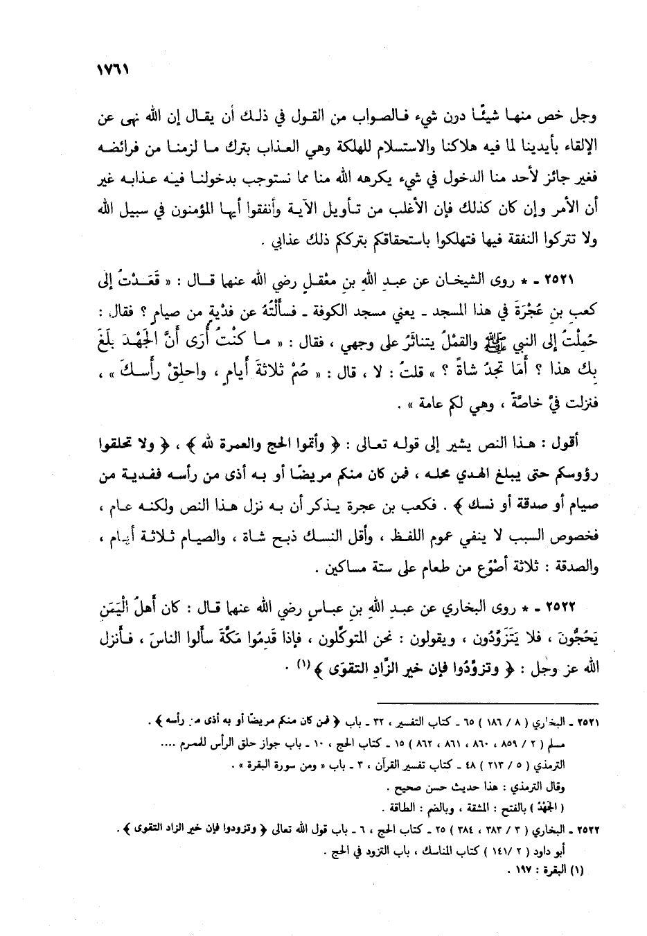 2521 - البخاري (8/ 186) 65 - كتاب التفسير، 32 - باب (فمن كان منكم مريضاً أو به أذى من رأسه).