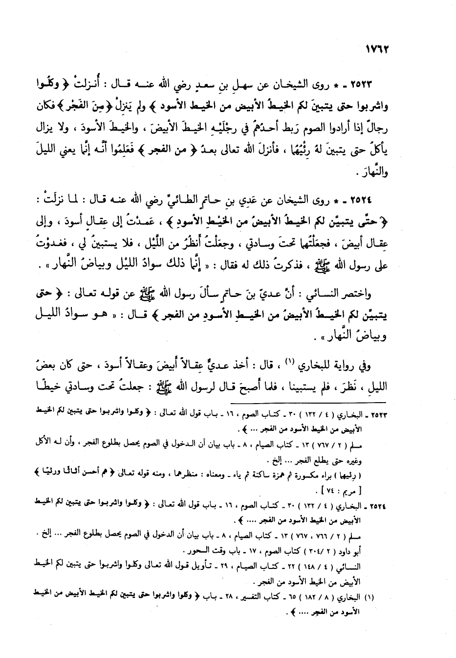 (1) البخاري (8/ 183) 65 - كتاب التفسير، 28 - باب (وكلوا واشربوا حتى يتبين لكم الخيط الأبيض من الخيط الأسود من الفجر ..).