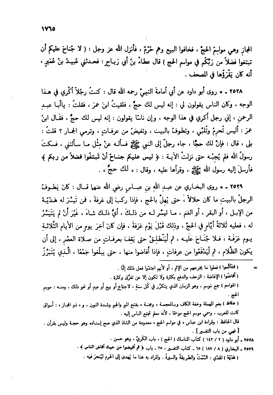 2528 - * روى أبو داود عن أبي أمامة التيميِّ رحمه الله قال: كنتُ رجلاً أكْري في هذا الوجه، وكان الناس يقولون لي: إنه ليس لك حجٌّ، فلقيتُ ابن عمر، فقلت: يا أبا عبد الرحمن، إني رجل أكري في هذا الوجه، وإن ناساً يقولون: إنه ليس لك حجٌّ، فقال ابن عمر: أليس تُحرمُ وتُلبي، وتطوف بالبيت، وتفيض من عرفات، وترمي الجمار؟ قلت: بلى، قال: فإن لك حجًّا، جاء رجلٌ إلى النبي صلى الله عليه وسلم فسأله عن مثل ما سألتني، فسكت رسول الله فلم يُجِبْه حتى نزلت الآية: {لَيْسَ عَلَيْكُمْ جُنَاحٌ أَنْ تَبْتَغُوا فَضْلًا مِنْ رَبِّكُمْ} فأرسل إليه رسول الله صلى الله عليه وسلم، وقرأها عليه، وقال: "لك حجٌّ".