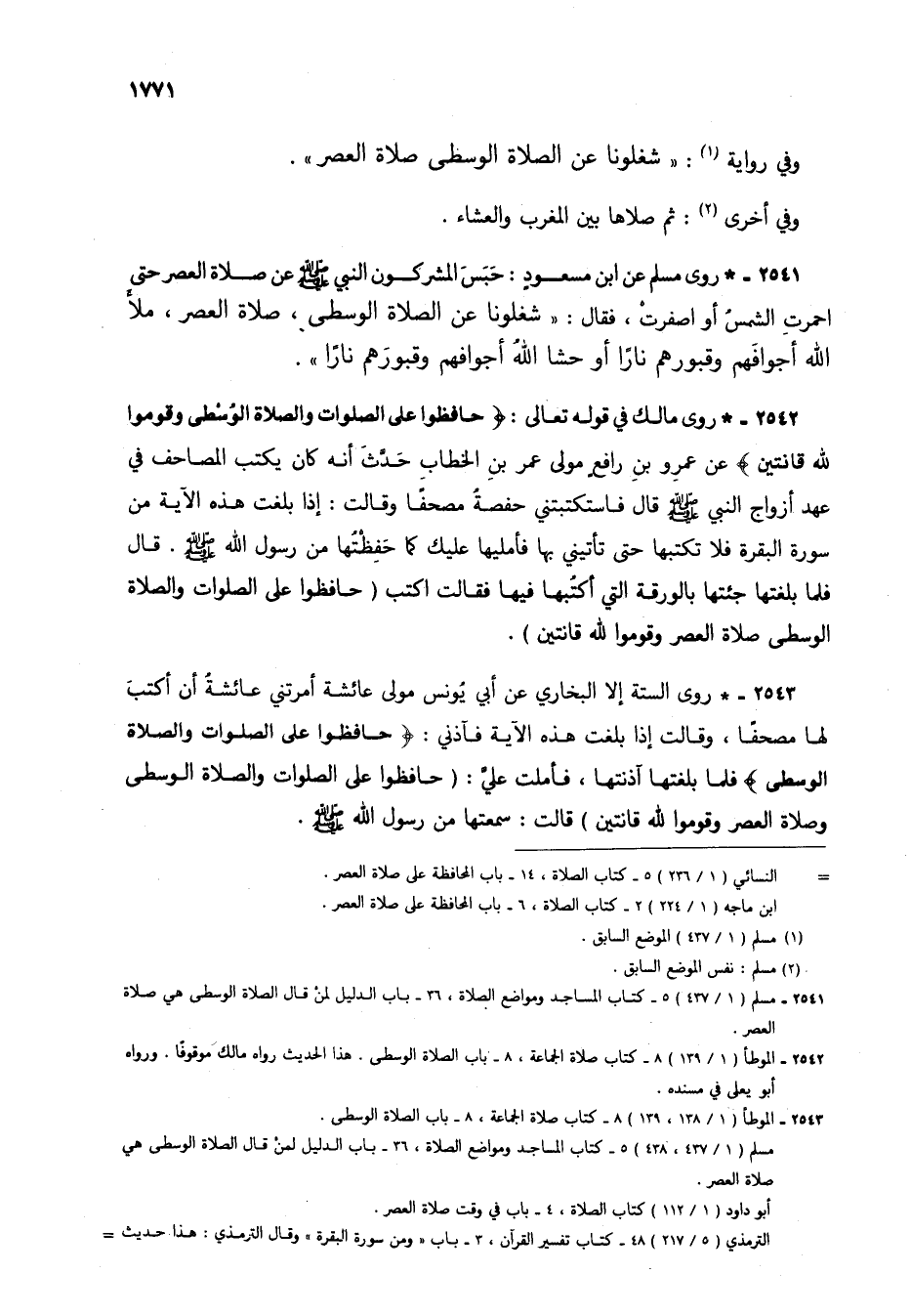 2543 - * روى الستة إلا البخاري عن أبي يُونس مولى عائشة أمرتني عائشة أن أكتب لها مصحفاً، وقالت إذا بلغت هذه الآية فآذني: {حَافِظُوا عَلَى الصَّلَوَاتِ وَالصَّلَاةِ الْوُسْطَى} فلما بلغتها آذنتها، فأملت عليَّ: (حافظوا على الصلوات والصلاة الوسطى وصلاة العصر وقوموا لله قانتين) قالت: سمعتها من رسول الله صلى الله علي وسلم.