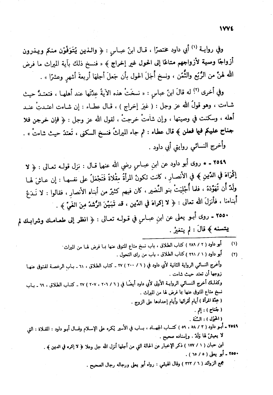 وفي رواية (1) أبي داود مختصراً، قال ابن عباس: {وَالَّذِينَ يُتَوَفَّوْنَ مِنْكُمْ وَيَذَرُونَ أَزْوَاجًا وَصِيَّةً لِأَزْوَاجِهِمْ مَتَاعًا إِلَى الْحَوْلِ غَيْرَ إِخْرَاجٍ} "فنسخ ذلك بآية الميراث ما فرض الله لهن من الرُّبُع والثُّمُن، ونسخ أجل الحول بأن جعل أجلها أربعة أشهرٍ وعشراً.