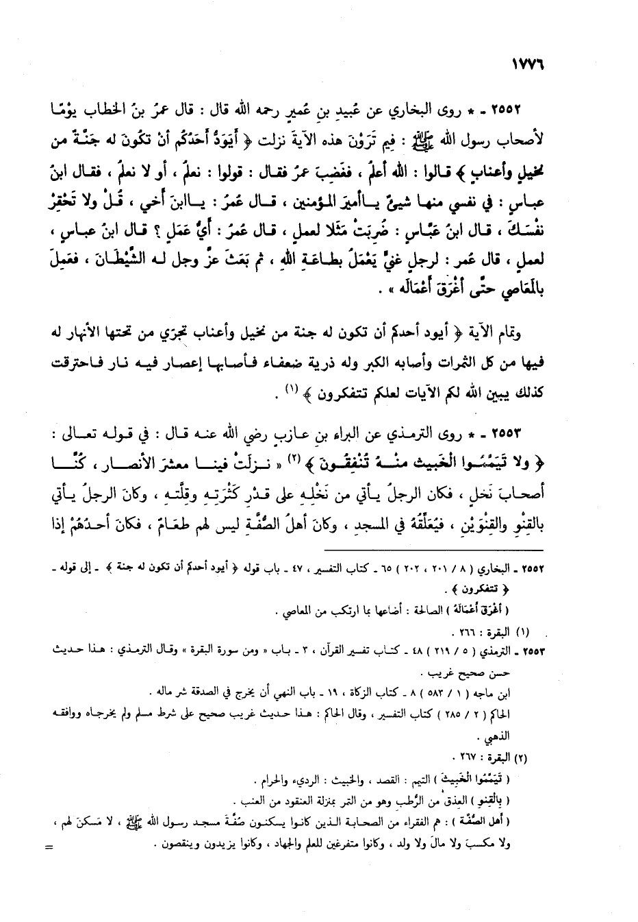 2552 - * روى البخاري عن عُبيد بن عُمير رحمه الله قال: قال عمر بن الخطاب يوماً لأصحاب رسول الله صلى الله عليه وسلم: فيم تروْنَ هذه الآية نزلت {أَيَوَدُّ أَحَدُكُمْ أَنْ تَكُونَ لَهُ جَنَّةٌ مِنْ نَخِيلٍ وَأَعْنَابٍ} قالوا: الله أعلمُ، فغضب عمر فقال: قولوا: نعلمُ، أو لا نعلمُ، فقال ابن عباس: في نفسي منها شيء يا أمير المؤمنين، قال عمر: يا ابن أخي، قل ولا تحقر نفسك، قال ابن عباس: ضُربتْ مثلاً لعمل، قال عمر: أيُّ عملٍ؟ قال ابن عباس، لعملٍ، قال عمر: لرجل غنيٍّ يعملُ بطاعة الله، ثم بعث عز وجل له الشيطان، فعمل بالمعاصي حتى أغرق أعماله".