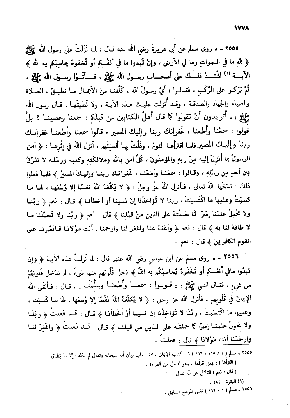 2556 - * روى مسلم عن ابن عباس رضي الله عنهما قال: لما نزلتْ هذه الآية {وَإِنْ تُبْدُوا مَا فِي أَنْفُسِكُمْ أَوْ تُخْفُوهُ يُحَاسِبْكُمْ بِهِ اللَّهُ} دخل قلوبهم منها شيءٌ، لم يدخل قلوبهم من شيء، فقال النبي صلى الله عليه وسلم: "قولوا: سمعنا وأطعنا وسلَّمْنَا"، قال: فألقى الله الإيمان في قلوبهم، فأنزل الله عز وجل: {لَا يُكَلِّفُ اللَّهُ نَفْسًا إِلَّا وُسْعَهَا لَهَا مَا كَسَبَتْ وَعَلَيْهَا مَا اكْتَسَبَتْ رَبَّنَا لَا تُؤَاخِذْنَا إِنْ نَسِينَا أَوْ أَخْطَأْنَا} قال: قد فعلتُ {رَبَّنَا وَلَا تَحْمِلْ عَلَيْنَا إِصْرًا كَمَا حَمَلْتَهُ عَلَى الَّذِينَ مِنْ قَبْلِنَا} قال: قد فعلتُ {وَاغْفِرْ لَنَا وَارْحَمْنَا أَنْتَ مَوْلَانَا} قال: فعلتُ.
