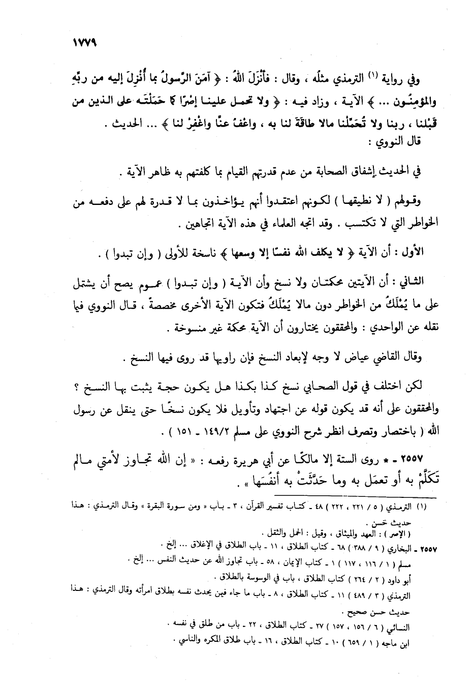 الثاني: أن الآيتين محكمتان ولا نسخ وأن الآية (وإن تبدوا) عموم يصح أن يشتمل على ما يُمْلَكُ من الخواطر دون ما لا يُملكُ فتكون الآية الأخرى مخصصةً، قال النووي فيما نقله عن الواحدي: والمحققون يختارون أن الآية محكمة غير منسوخة.