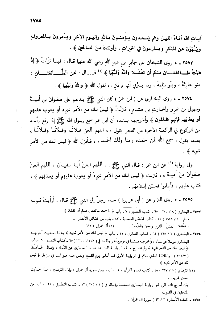 2574 - * روى البخاري عن (ابن عمر) كان النبي صلى الله عليه وسلم يدعو على صفوان بن أمية وسهيل بن عمروٍ والحارث بن هشامٍ، فنزلت {لَيْسَ لَكَ مِنَ الْأَمْرِ شَيْءٌ أَوْ يَتُوبَ عَلَيْهِمْ أَوْ يُعَذِّبَهُمْ فَإِنَّهُمْ ظَالِمُونَ} وأخرجها بسنده أن ابن عمر سمع رسول الله صلى الله عليه وسلم إذا رفع رأسه من الركوع في الركعة الآخرة من الفجر يقول: "اللهم العن فلاناً وفلاناً وفلاناً" بعدما يقول "سمع الله لمن حَمِده ربنا ولك الحمد"، فأنزل الله {لَيْسَ لَكَ مِنَ الْأَمْرِ شَيْءٌ}.