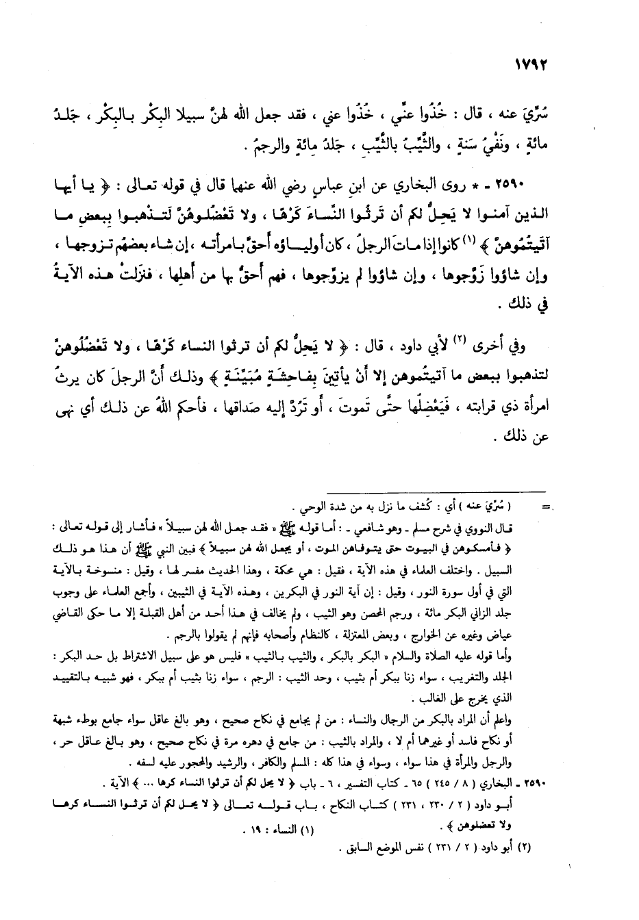 2590 - * روى البخاري عن ابن عباس رضي الله عنهما قال في قوله تعالى: {يَاأَيُّهَا الَّذِينَ آمَنُوا لَا يَحِلُّ لَكُمْ أَنْ تَرِثُوا النِّسَاءَ كَرْهًا وَلَا تَعْضُلُوهُنَّ لِتَذْهَبُوا بِبَعْضِ مَا آتَيْتُمُوهُنَّ} (1) كانوا إذا مات الرجلُ، كان أولياؤه أحقَّ بامرأته، إن شاء بعضهُم تزوجها، وإن شاؤوا زَوَّجوها، وإن شاؤوا لم يزوِّجوها، فهم أحقُّ بها من أهلها، فنزلتْ هذه الآية في ذلك.