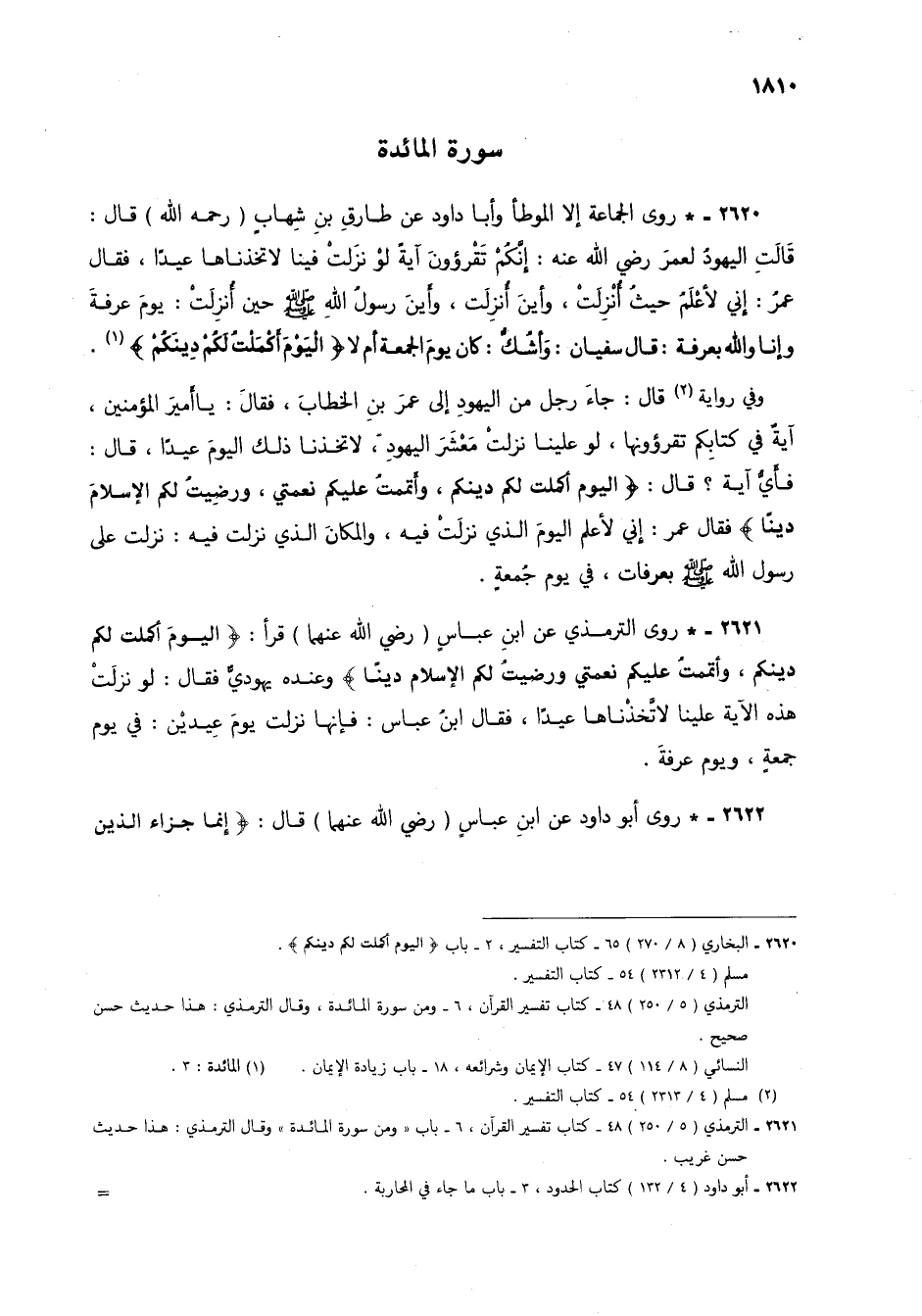 2620 - * روى الجماعة إلى الموطأ وأبا داود عن طارق بن شهاب (رحمه الله) قال: قالت اليهودُ لعمر رضي الله عنه: إنكُمْ تقرؤون آيةً لوْ نزلتْ فينا لاتخذناها عيداً، فقال عمر: إني لأعلَمُ حيثُ أُنزِلَتْ، وأين أُنزلت، وأين رسول الله صلى الله عليه وسلم حين أُنزلتْ: يوم عرفة وإنا والله بعرفة: قال سفيان: وأشُكُّ: كان يوم الجمعة أم لا {الْيَوْمَ أَكْمَلْتُ لَكُمْ دِينَكُمْ} (1).