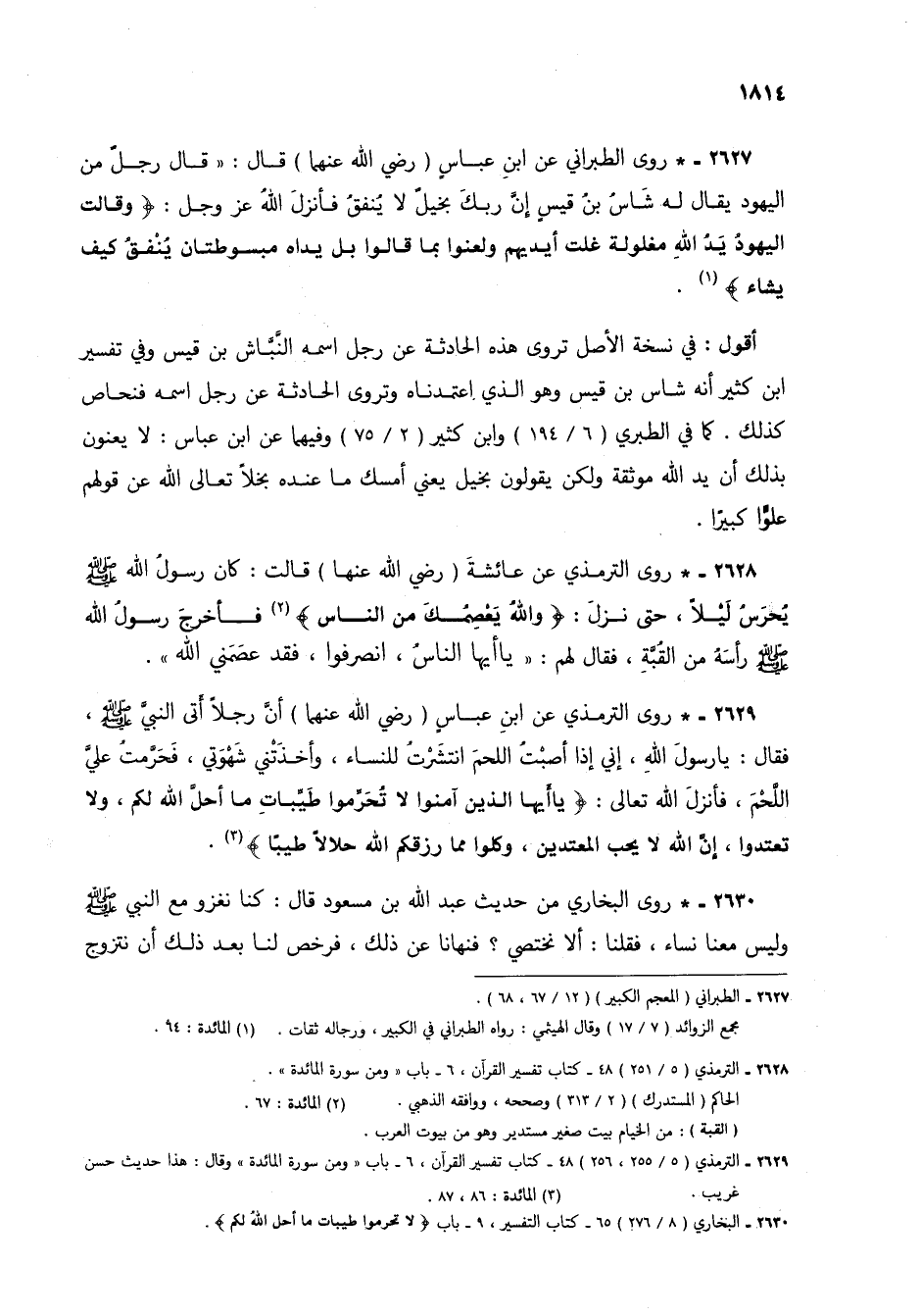 2627 - * روى الطبراني عن ابن عباس (رضي الله عنهما) قال: "قال رجلٌ من اليهود يقال له شاسُ بن قيسٍ إنَّ ربك بخيلٌ لا ينفقُ فأنزل الله عز وجل: {وَقَالَتِ الْيَهُودُ يَدُ اللَّهِ مَغْلُولَةٌ غُلَّتْ أَيْدِيهِمْ وَلُعِنُوا بِمَا قَالُوا بَلْ يَدَاهُ مَبْسُوطَتَانِ يُنْفِقُ كَيْفَ يَشَاءُ} (1).