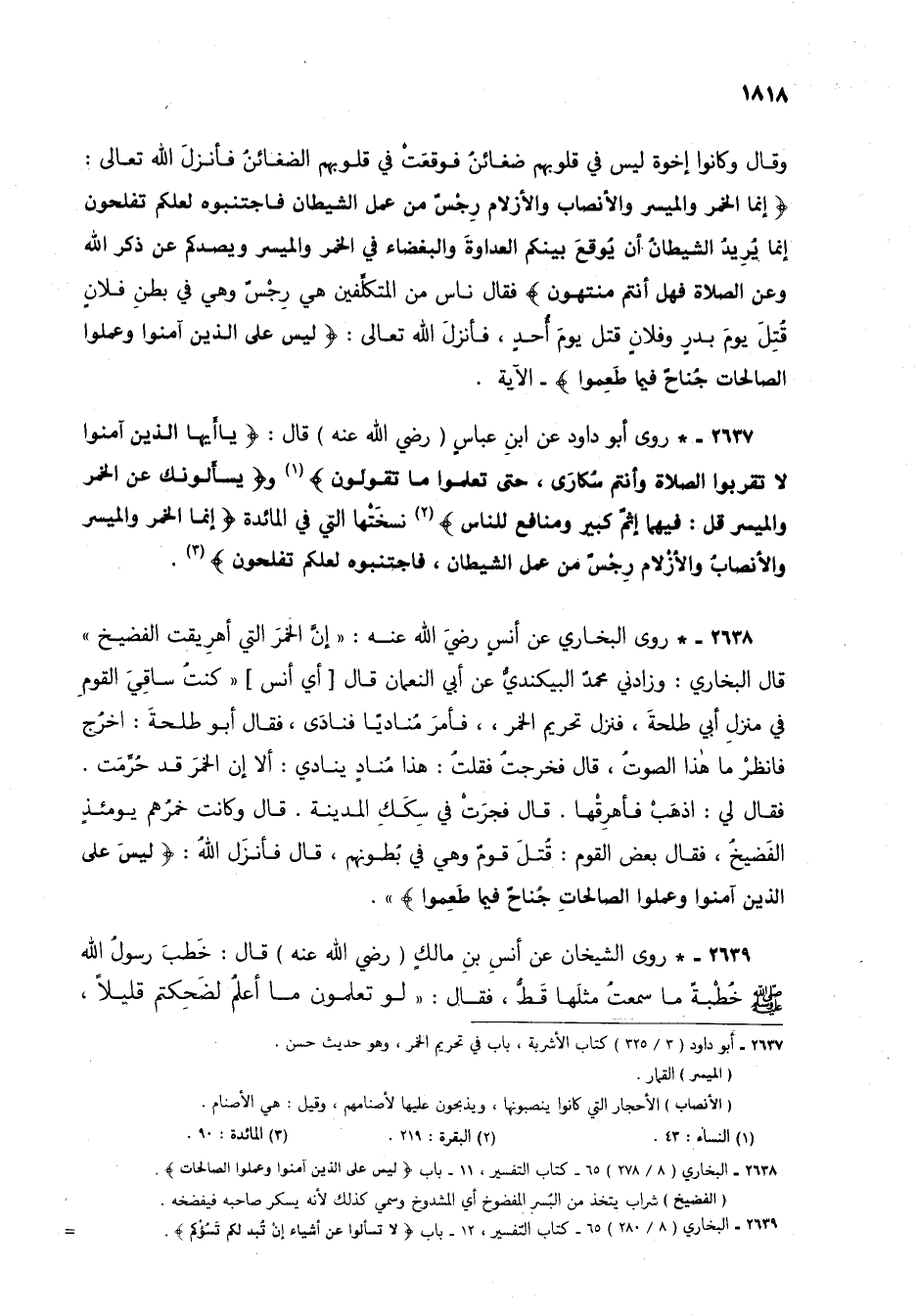 2637 - * روى أبو داود عن ابن عباس (رضي الله عنه) قال: {يَاأَيُّهَا الَّذِينَ آمَنُوا لَا تَقْرَبُوا الصَّلَاةَ وَأَنْتُمْ سُكَارَى حَتَّى تَعْلَمُوا مَا تَقُولُونَ} (1) و {يَسْأَلُونَكَ عَنِ الْخَمْرِ وَالْمَيْسِرِ قُلْ فِيهِمَا إِثْمٌ كَبِيرٌ وَمَنَافِعُ لِلنَّاسِ} (2) نسختْها التي في المائدة {إِنَّمَا الْخَمْرُ وَالْمَيْسِرُ وَالْأَنْصَابُ وَالْأَزْلَامُ رِجْسٌ مِنْ عَمَلِ الشَّيْطَانِ فَاجْتَنِبُوهُ لَعَلَّكُمْ تُفْلِحُونَ} (3).