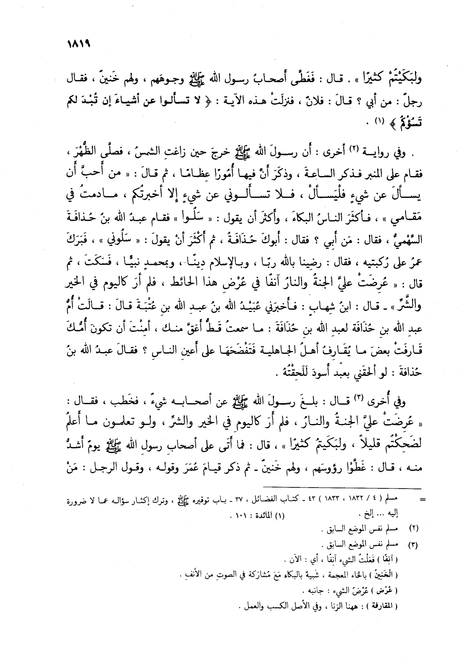 ولبكيْتُمْ كثيراً". قال: فغطَّى أصحاب رسول الله صلى الله عليه وسلم وجوههم، ولهم خَنينٌ، فقال رجلٌ: من أبي؟ قال: فلانٌ، فنزلتْ هذه الآية: {لَا تَسْأَلُوا عَنْ أَشْيَاءَ إِنْ تُبْدَ لَكُمْ تَسُؤْكُمْ} (1).