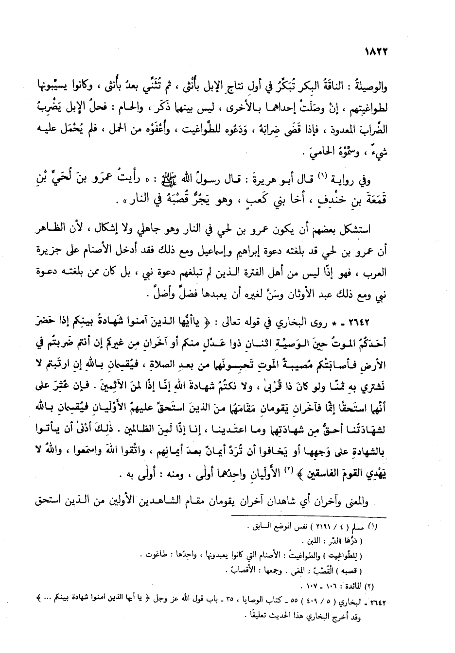 2642 - * روى البخاري في قوله تعالى: {يَاأَيُّهَا الَّذِينَ آمَنُوا شَهَادَةُ بَيْنِكُمْ إِذَا حَضَرَ أَحَدَكُمُ الْمَوْتُ حِينَ الْوَصِيَّةِ اثْنَانِ ذَوَا عَدْلٍ مِنْكُمْ أَوْ آخَرَانِ مِنْ غَيْرِكُمْ إِنْ أَنْتُمْ ضَرَبْتُمْ فِي الْأَرْضِ فَأَصَابَتْكُمْ مُصِيبَةُ الْمَوْتِ تَحْبِسُونَهُمَا مِنْ بَعْدِ الصَّلَاةِ فَيُقْسِمَانِ بِاللَّهِ إِنِ ارْتَبْتُمْ لَا نَشْتَرِي بِهِ ثَمَنًا وَلَوْ كَانَ ذَا قُرْبَى وَلَا نَكْتُمُ شَهَادَةَ اللَّهِ إِنَّا إِذًا لَمِنَ الْآثِمِينَ فَإِنْ عُثِرَ عَلَى أَنَّهُمَا اسْتَحَقَّا إِثْمًا فَآخَرَانِ يَقُومَانِ مَقَامَهُمَا مِنَ الَّذِينَ اسْتَحَقَّ عَلَيْهِمُ الْأَوْلَيَانِ فَيُقْسِمَانِ بِاللَّهِ لَشَهَادَتُنَا أَحَقُّ مِنْ شَهَادَتِهِمَا وَمَا اعْتَدَيْنَا إِنَّا إِذًا لَمِنَ الظَّالِمِينَ ذَلِكَ أَدْنَى أَنْ يَأْتُوا بِالشَّهَادَةِ عَلَى وَجْهِهَا أَوْ يَخَافُوا أَنْ تُرَدَّ أَيْمَانٌ بَعْدَ أَيْمَانِهِمْ وَاتَّقُوا اللَّهَ وَاسْمَعُوا وَاللَّهُ لَا يَهْدِي الْقَوْمَ الْفَاسِقِينَ} (2) الأوليان واحدُها أولى، ومنه: أولى به.