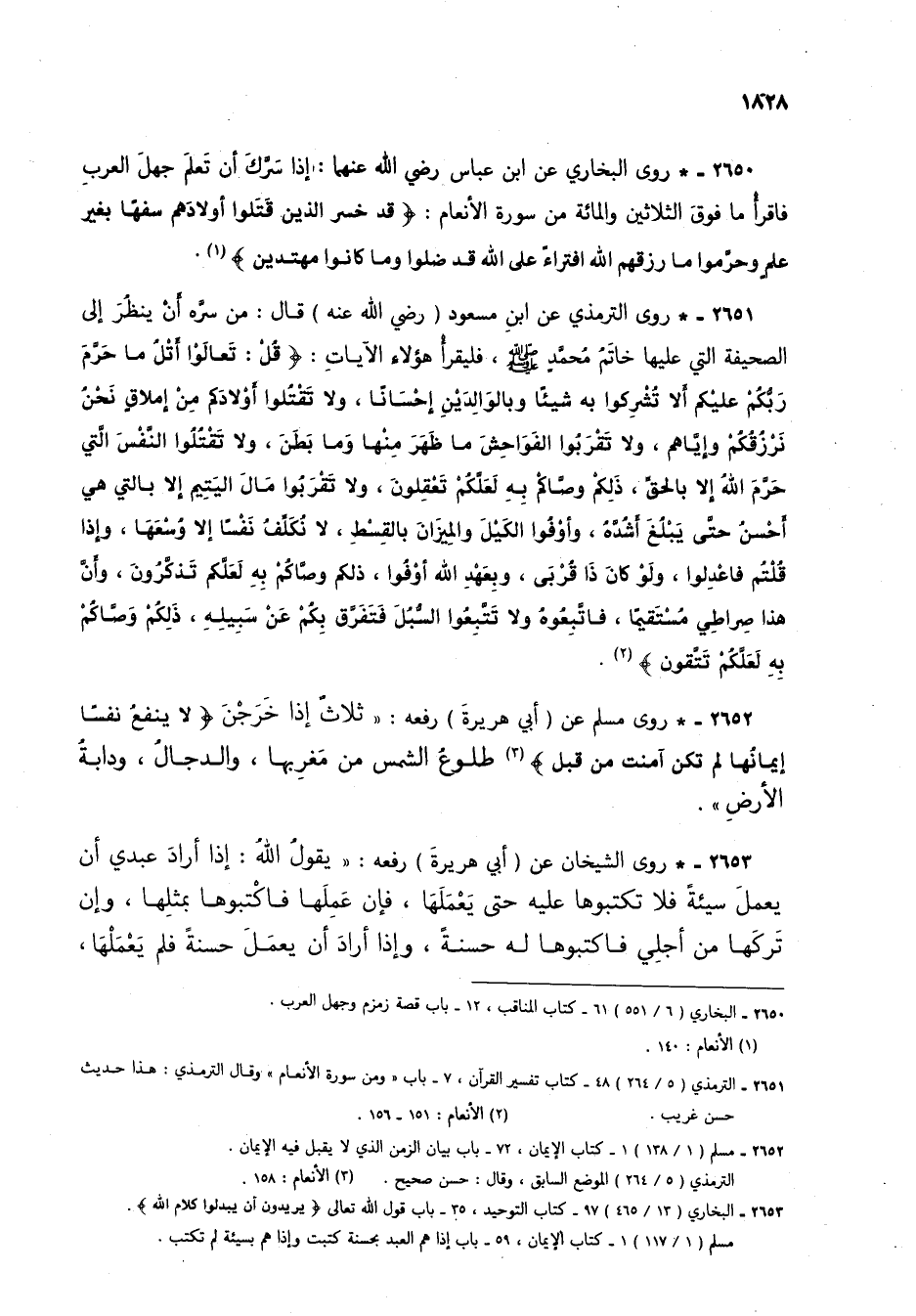 2650 - * روى البخاري عن ابن عباس رضي الله عنهما: إذا سَرَّكَ أن تعلمَ جهلَ العرب فاقرأ ما فوق الثلاثين والمائة من سورة الأنعام: {قَدْ خَسِرَ الَّذِينَ قَتَلُوا أَوْلَادَهُمْ سَفَهًا بِغَيْرِ عِلْمٍ وَحَرَّمُوا مَا رَزَقَهُمُ اللَّهُ افْتِرَاءً عَلَى اللَّهِ قَدْ ضَلُّوا وَمَا كَانُوا مُهْتَدِينَ} (1).