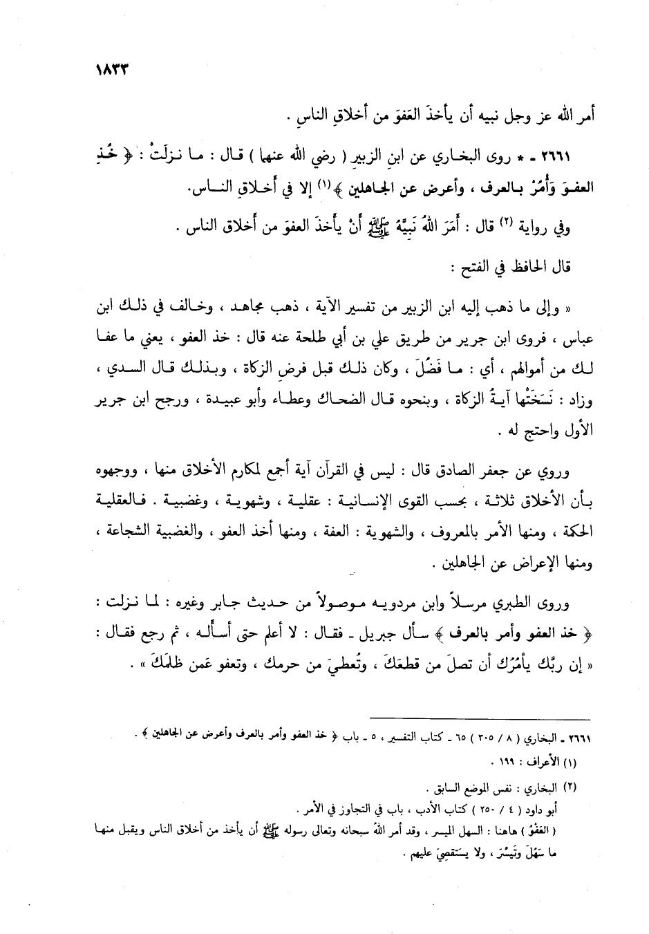 2661 - * روى البخاري عن ابن الزبير (رضي الله عنهما) قال: ما نزلت: {خُذِ الْعَفْوَ وَأْمُرْ بِالْعُرْفِ وَأَعْرِضْ عَنِ الْجَاهِلِينَ} (1) إلا في أخلاق الناس.