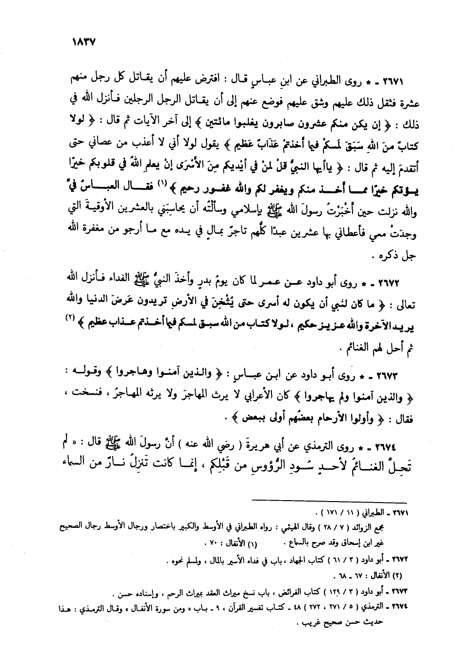 2674 - الترمذي (5/ 271، 272) 48 - كتاب تفسير القرآن، 9 - باب "ومن سورة الأنفال" وقال الترمذي: هذا حديث حسن صحيح غريب.