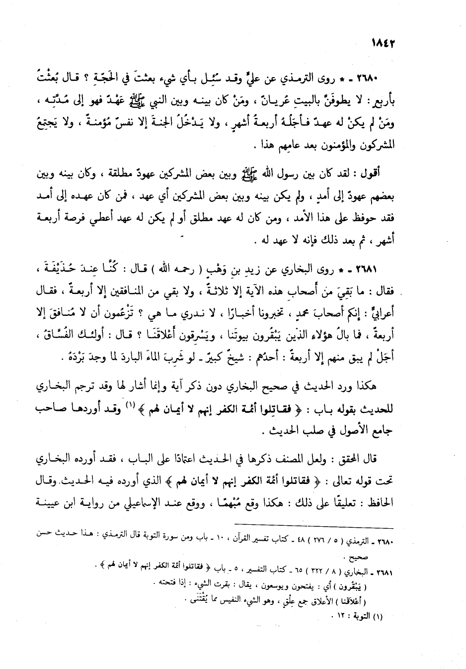 قال المحقق: ولعل المصنف ذكرها في الحديث اعتماداً على الباب، فقد أورده البخاري تحت قوله تعالى: {فَقَاتِلُوا أَئِمَّةَ الْكُفْرِ إِنَّهُمْ لَا أَيْمَانَ لَهُمْ} الذي أورده فيه الحديث وقال الحافظ: تعليقاً على ذلك: هكذا وقع مبهماً، وقع عند الإسماعيلي من رواية ابن عيينة