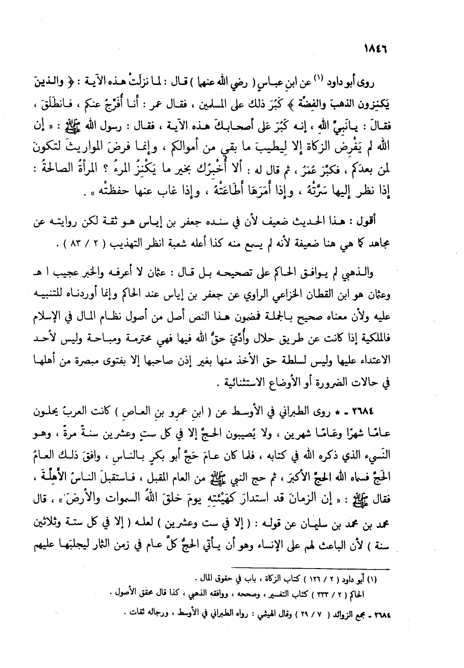 والذهبي لم يوافق الحاكم على تصحيحه بل قال: عثمان لا أعرفه والخبر عجيب اهـ وعثمان هو ابن القطان الخزاعي الراوي عن جعفر بن إياس عند الحاكم وإنما أوردناه للتنبيه عليه ولأن معناه صحيح بالجملة فمضمون هذا النص أصل من أصول نظام المال في الإسلام فالملكية إذا كانت عن طريق حلال وأُدِّيَ حقُّ الله فيها فهي محترمة ومباحة وليس لأحد الاعتداء عليها وليس لسلطة حق الأخذ منها بغير إذن صاحبها إلا بفتوى مبصرة من أهلها في حالات الضرورة أو الأوضاع الاستثنائية.