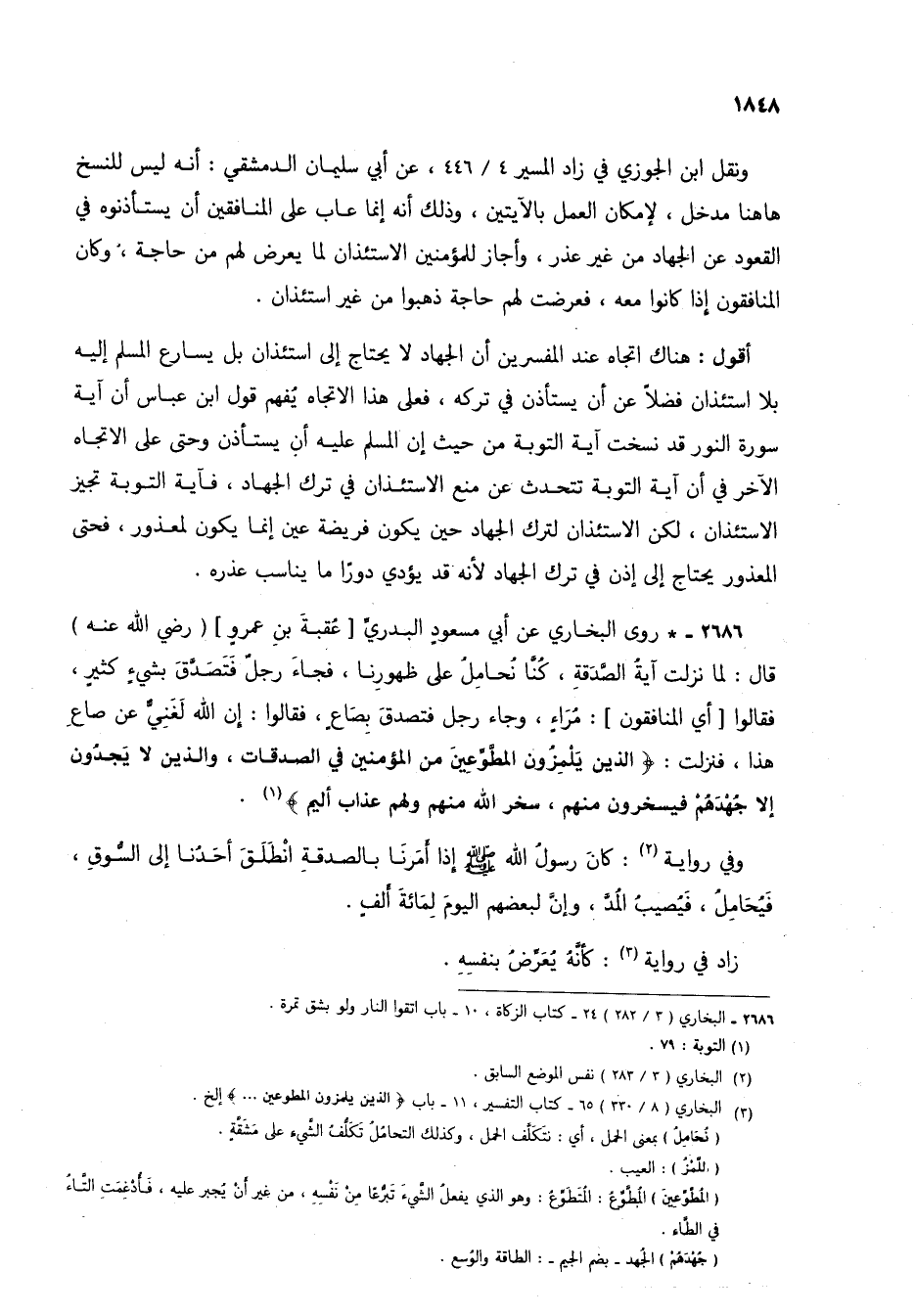 (3) البخاري (8/ 330) 65 - كتاب التفسير، 11 - باب (الذين يلمزون المطوعين ..) إلخ.