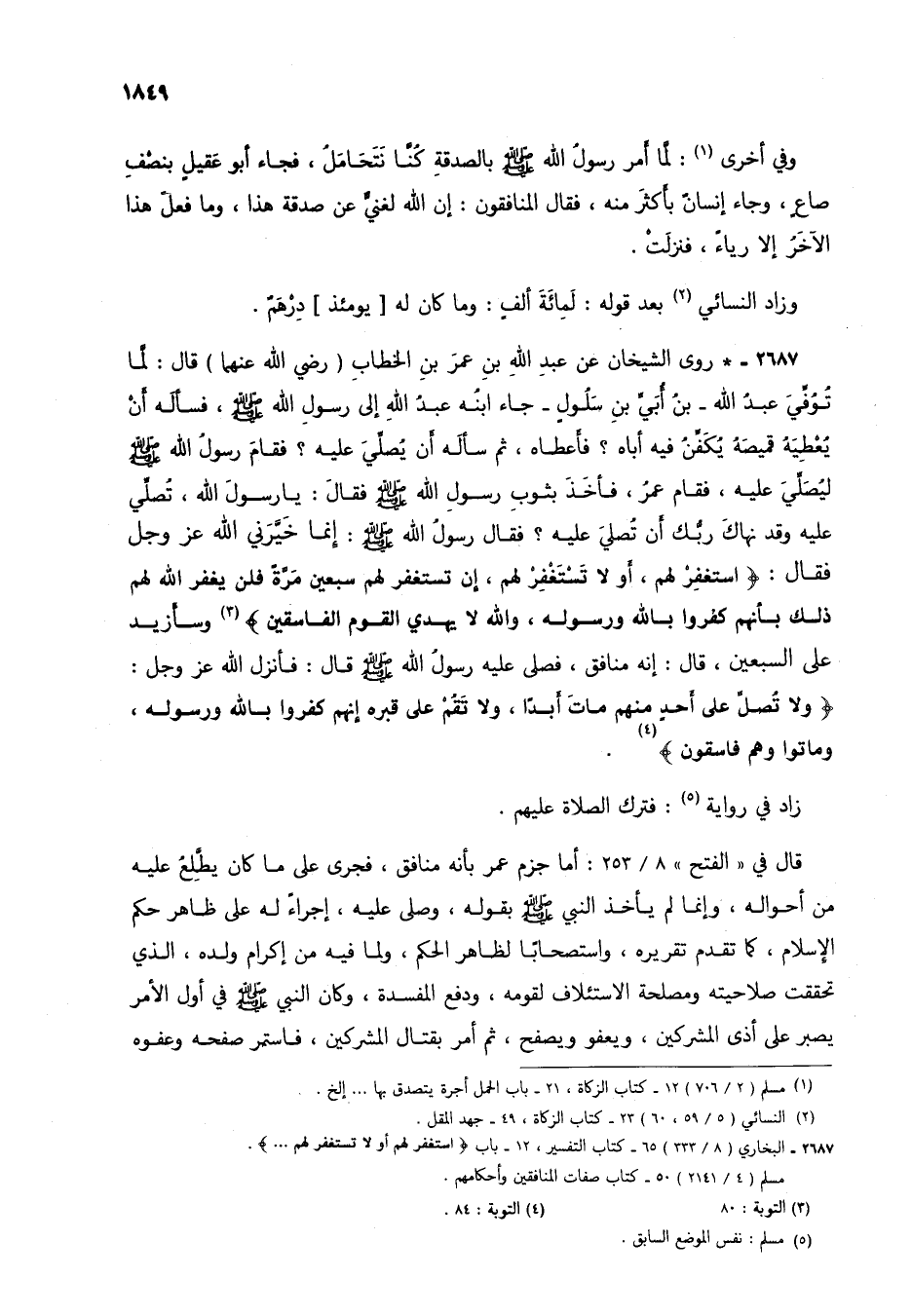 2687 - * روى الشيخان عن عبد الله بن عمر بن الخطاب (رضي الله عنهما) قال: لما تُوفي عبد الله - بن أُبي بن سلولٍ - جاء ابنه عبد الله إلى رسول الله صلى الله عليه وسلم، فسأله أنْ يعطيه قميصه يُكَفِّنُ فيه أباه؟ فأعطاه، ثم سأله أن يصلي عليه؟ فقام رسول الله صلى الله عليه وسلم ليصلي عليه، فقام عمر، فأخذ بثوب رسول الله صلى الله عليه وسلم فقال: يا رسول الله، تُصلي عليه وقد نهاك ربك أن تصلي عليه؟ فقال رسول الله صلى الله عليه وسلم: إنما خيَّرَني الله عز وجل فقال: {اسْتَغْفِرْ لَهُمْ أَوْ لَا تَسْتَغْفِرْ لَهُمْ إِنْ تَسْتَغْفِرْ لَهُمْ سَبْعِينَ مَرَّةً فَلَنْ يَغْفِرَ اللَّهُ لَهُمْ ذَلِكَ بِأَنَّهُمْ كَفَرُوا بِاللَّهِ وَرَسُولِهِ وَاللَّهُ لَا يَهْدِي الْقَوْمَ الْفَاسِقِينَ} (3) وسأزيد على السبعين، قال: إنه منافق، فصلى عليه رسول الله صلى الله عليه وسلم قال: فأنزل الله عز وجل: {وَلَا تُصَلِّ عَلَى أَحَدٍ مِنْهُمْ مَاتَ أَبَدًا وَلَا تَقُمْ عَلَى قَبْرِهِ إِنَّهُمْ كَفَرُوا بِاللَّهِ وَرَسُولِهِ وَمَاتُوا وَهُمْ فَاسِقُونَ} (4).