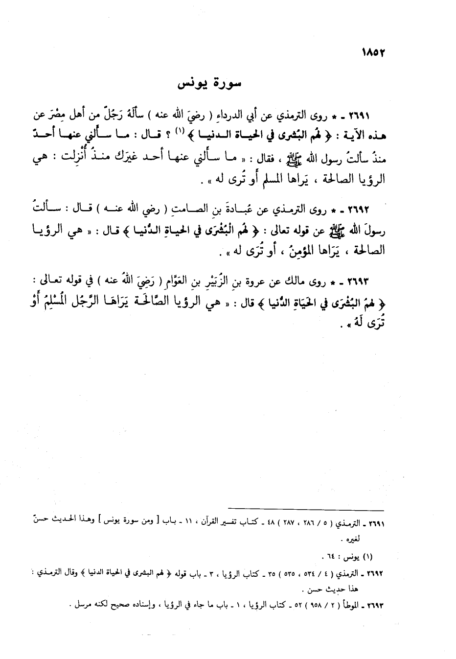2691 - * روى الترمذي عن أبي الدرداء (رضي الله عنه) سأله رجلٌ من أهل مصر عن هذه الآية: {لَهُمُ الْبُشْرَى فِي الْحَيَاةِ الدُّنْيَا} (1)؟ قال: ما سألني عنها أحد منذ سألت رسول الله صلى الله عليه وسلم، فقال: "ما سألني عنها أحد غيرك منذ أُنزلت: هي الرؤيا الصالحة، يراها المسلم أو تُرى له".