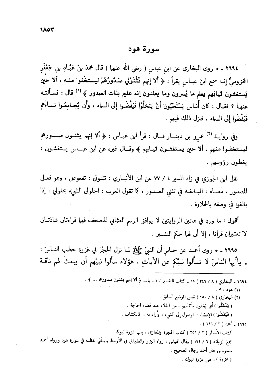 2694 - * روى البخاري عن ابن عباس (رضي الله عنهما) قال محمد بن عباد بن جعفر المخزومي إنه سمع ابن عباس يقرأ: {أَلَا إِنَّهُمْ تَثْنَوْني صُدُورَهُمْ لِيَسْتَخْفُوا مِنْهُ أَلَا حِينَ يَسْتَغْشُونَ ثِيَابَهُمْ يَعْلَمُ مَا يُسِرُّونَ وَمَا يُعْلِنُونَ إِنَّهُ عَلِيمٌ بِذَاتِ الصُّدُورِ} (1) قال: فسألته عنها؟ فقال: كان أناس يستحيون أن يتخلوا فيُفضوا إلى السماء، وأن يجامعوا نساءهم فيفضوا إلى السماء، فنزل ذلك فيهم.