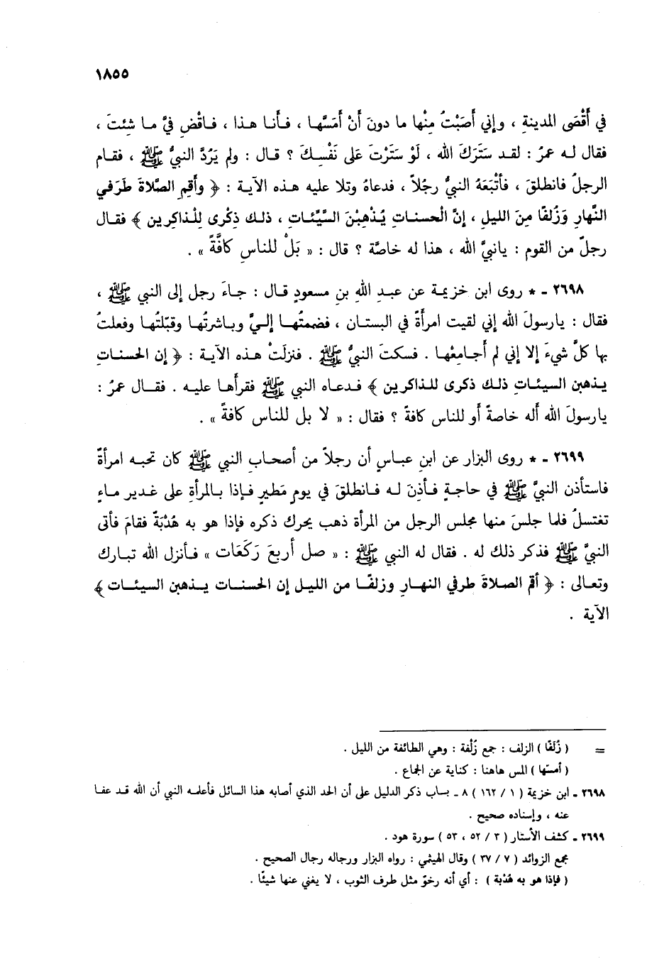 2699 - * روى البزار عن ابن عباس أن رجلاً من أصحاب النبي صلى الله عليه وسلم كان تحبه امرأةً فاستأذن النبي صلى الله عليه وسلم في حاجة فأذن له فانطلق في يوم مطيرٍ فإذا بالمرأة على غدير ماء تغتسل فلما جلس منها مجلس الرجل من المرأة ذهب يحرك ذكره فإذا هو به هدبةٌ فقام فأتى النبي صلى الله عليه وسلم فذكر ذلك له. فقال له النبي صلى الله عليه وسلم: "صل أربع ركعات" فأنزل الله تبارك وتعالى: {وَأَقِمِ الصَّلَاةَ طَرَفَيِ النَّهَارِ وَزُلَفًا مِنَ اللَّيْلِ إِنَّ الْحَسَنَاتِ يُذْهِبْنَ السَّيِّئَاتِ} (1) الآية.