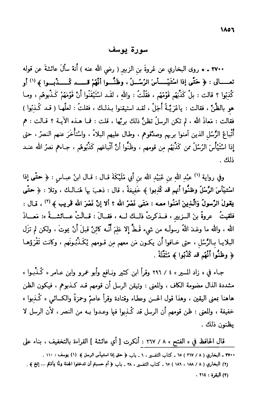 2700 - * روى البخاري عن عروة بن الزبير (رضي الله عنه) أنه سأل عائشة عن قوله تعالى: {حَتَّى إِذَا اسْتَيْأَسَ الرُّسُلُ وَظَنُّوا أَنَّهُمْ قَدْ كُذِبُوا} (1) أو كُذبوا؟ قالت: بل كذبهم قومهم، فقلت: والله، لقد استيقنوا أن قومهم كذبوهم، وما هو بالظن، فقالت: يا عُرَيَّةُ أجلْ، لقد استيقنوا بذلك، فقلت: لعلها (قد كُذبوا) فقالت: معاذ الله، لم تكن الرسل تظنُّ ذلك بربها، قلت: فما هذه الآية؟ قالت: هم أتباع الرسل الذين آمنوا بربهم وصدقوهم، وطال عليهم البلاء، واستأخر عنهم النصر، حتى إذا استيأس الرسل ممن كذبهم من قومهم، وظنوا أن أتباعم كذبُوهم، جاءهم نصر الله عند ذلك.
