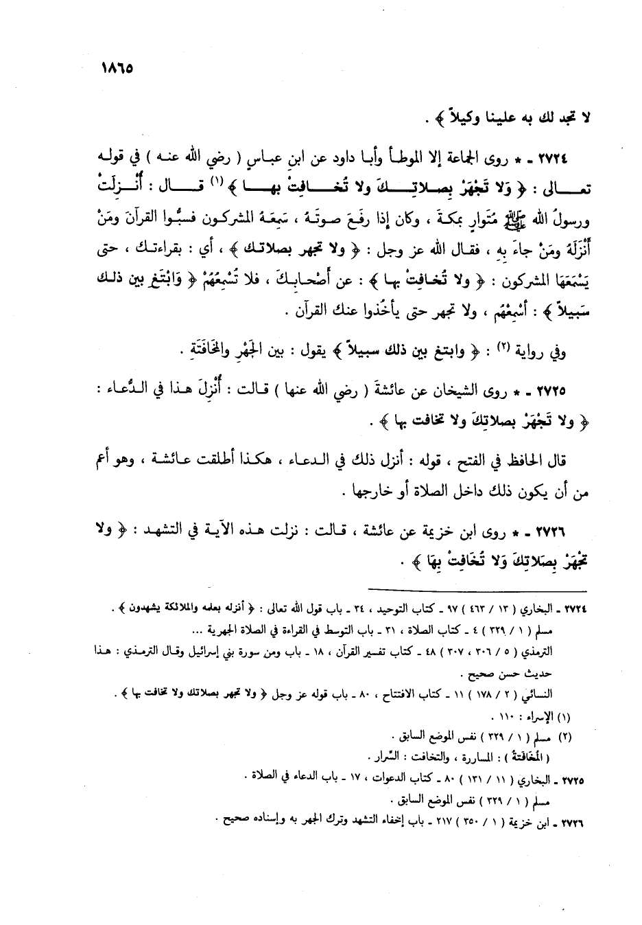 2725 - * روى الشيخان عن عائشة (رضي الله عنها) قالت: أُنزل هذا في الدعاء: {وَلَا تَجْهَرْ بِصَلَاتِكَ وَلَا تُخَافِتْ بِهَا}.