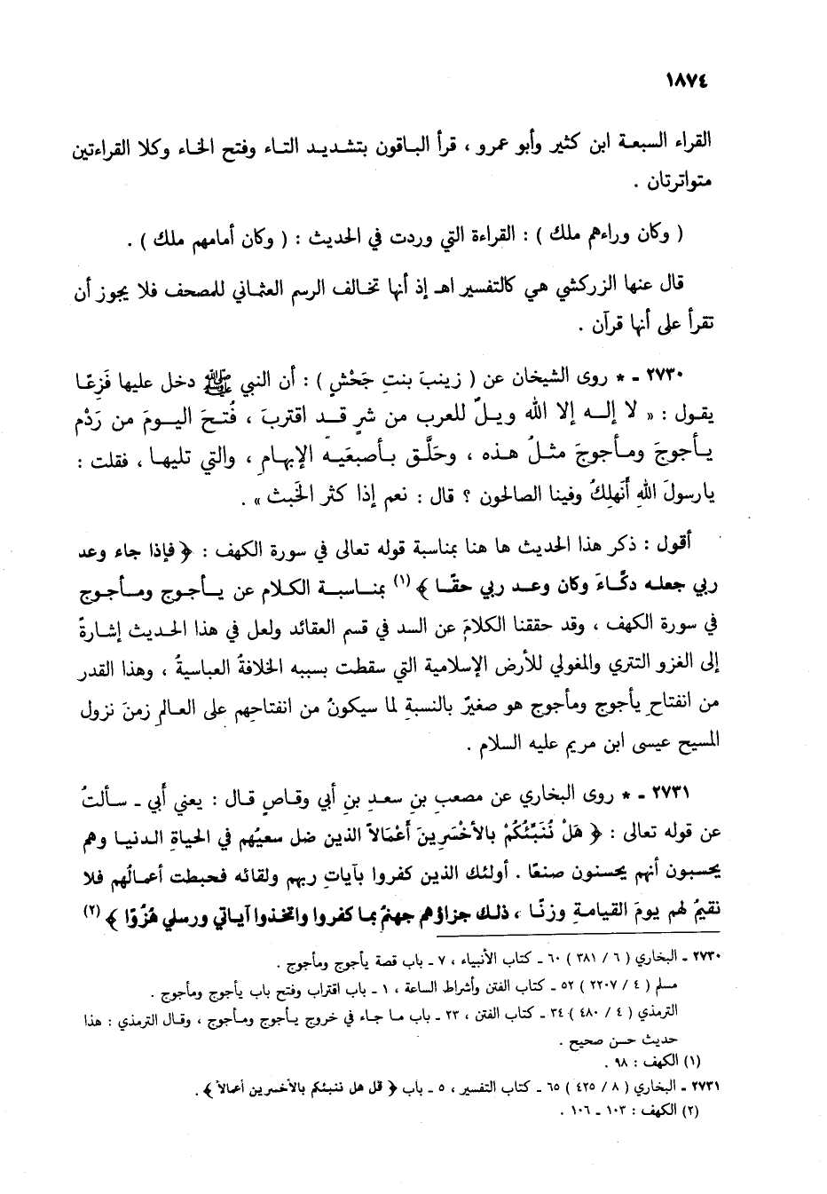 2731 - * روى البخاري عن مصعب بن سعد بن أبي وقاصٍ قال: يعني أبي - سألتُ عن قوله تعالى: {قُلْ هَلْ نُنَبِّئُكُمْ بِالْأَخْسَرِينَ أَعْمَالًا الَّذِينَ ضَلَّ سَعْيُهُمْ فِي الْحَيَاةِ الدُّنْيَا وَهُمْ يَحْسَبُونَ أَنَّهُمْ يُحْسِنُونَ صُنْعًا أُولَئِكَ الَّذِينَ كَفَرُوا بِآيَاتِ رَبِّهِمْ وَلِقَائِهِ فَحَبِطَتْ أَعْمَالُهُمْ فَلَا نُقِيمُ لَهُمْ يَوْمَ الْقِيَامَةِ وَزْنًا ذَلِكَ جَزَاؤُهُمْ جَهَنَّمُ بِمَا كَفَرُوا وَاتَّخَذُوا آيَاتِي وَرُسُلِي هُزُوًا} (2).