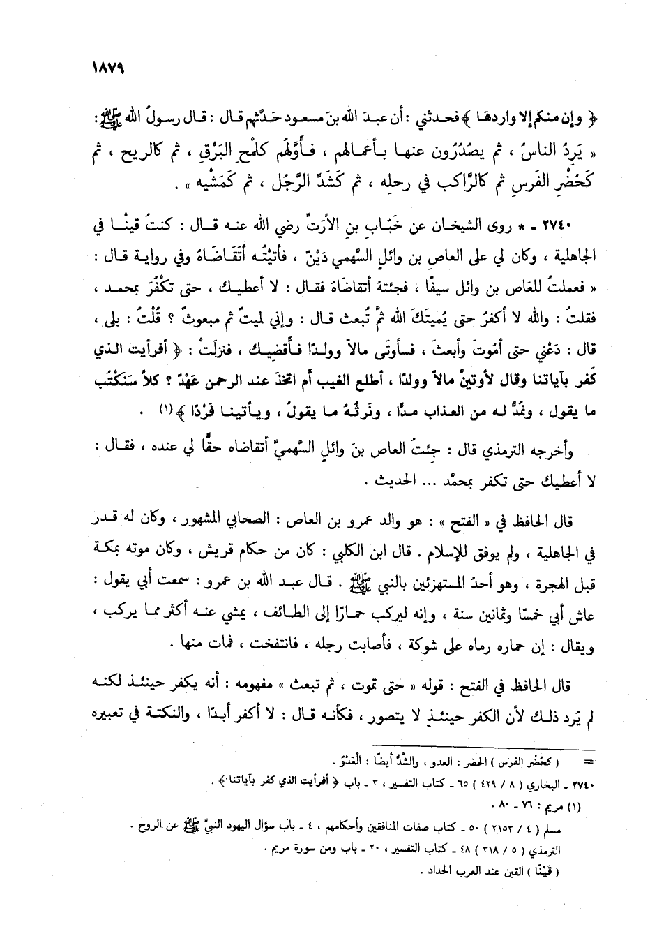 2740 - * روى الشيخان عن خباب بن الأرت رضي الله عنه قال: كنتُ قينْا في الجاهلية، وكان لي على العاص بن وائل السهمي دينٌ، فأتيته أتقاضاه وفي رواية قال: "فعملت للعاص بن وائل سيفاً، فجئته أتقاضاه فقال: لا أعطيك، حتى تكفر بمحمد، فقلت: والله لا أكفر حتى يميتك الله ثم تُبعث قال: وإني لميت ثم مبعوثٌ؟ قلت: بلى، قال: دعني حتى أموت وأبعث، فسأوتي مالاً وولداً فأقضيك، فنزلت: {أَفَرَأَيْتَ الَّذِي كَفَرَ بِآيَاتِنَا وَقَالَ لَأُوتَيَنَّ مَالًا وَوَلَدًا أَطَّلَعَ الْغَيْبَ أَمِ اتَّخَذَ عِنْدَ الرَّحْمَنِ عَهْدًا كَلَّا سَنَكْتُبُ مَا يَقُولُ وَنَمُدُّ لَهُ مِنَ الْعَذَابِ مَدًّا وَنَرِثُهُ مَا يَقُولُ وَيَأْتِينَا فَرْدًا} (1).