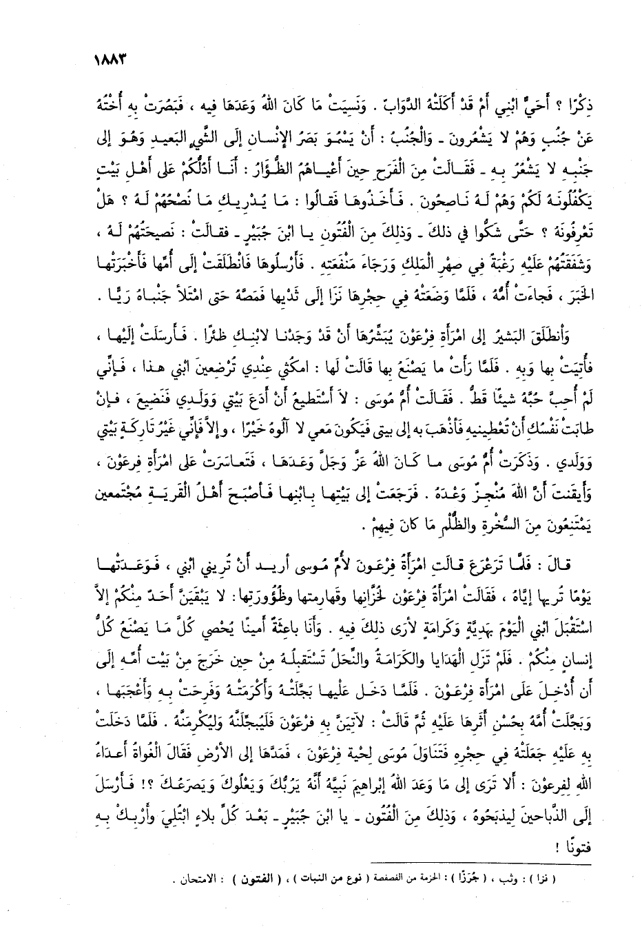 ذكراً؟ أحيٌّ ابني أم قد أكلته الدواب. ونسيتْ ما كان الله وعدها فيه، فبصُرت به أخته عن جُنب وهم لا يشعرون - والجُنُب: أن يسمو بصر الإنسان إلى الشيء البعيد وهو إلى جنبه لا يشعر به- فقالت من الفرح حين أعياهم الظؤارُ: أنا أدُلُّكم على أهل بيتٍ يكفلونه لكم وهم له ناصحون. فأخذوها فقالوا: ما يدريك ما نُصحهم له؟ هل تعرفونه؟ حتى شكوا في ذلك- وذلك من الفتون يا ابن جبير - فقالت: نصيحتهم له، وشفقتهم عليه رغبةً في صهر الملك ورجاء منفعته. فأرسلوها فانطلقت إلى أمها فأخبرتها الخبر، فجاءت أمه، فلما وضعته في حجرها نزا إلى ثديها فمصه حتى امتلأ جنباهُ ريًّا.