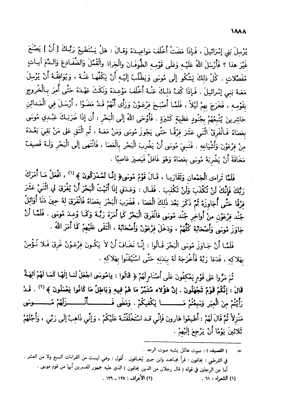 يرسل بني إسرائيل، فإذا مضت أخلفَ مواعيدهُ وقال: هل يستطيع ربك [أنْ] يصنع غير هذا؟ فأرسل الله عليه وعلى قومه الطوفان والجراد والقُمل والضفادع والدم آياتٍ مفصلاتٍ. كل ذلك يشكو إلى موسى ويطلب إليه أن يكُفها عنه، ويوافقه أن يرسل معه بني إسرائيل. فإذا كُفَّ ذلك عنه أخلف موعده ونكث عهده حتى أمر بالخروج بقومه، فخرج بهم ليلاً، فلما أصبح فرعون ورأى أنهم قد مضوا، أرسل في المدائن حاشرين يتبعهم بجنودٍ عظيمةٍ كثيرةٍ. فأوحى الله إلى البحر: أن إذا ضربك عبدي موسى بعصاه فانفرق اثنى عشر فرقاً حتى يجوز موسى ومن معه، ثم التق على من بقي بعده من فرعون وأشياعه. فنسي موسى أن يضرب البحر بالعصا، فانهى إلى البحر وله قصيفٌ مخافة أن يضربه موسى بعصاه وهو غافلٌ فيصير عاصياً.