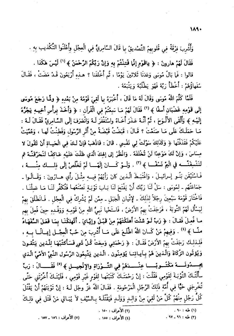 فلما كلم الله موسى وقال له ما قال، أخبره بما لقي قومه من بعده {وَلَمَّا رَجَعَ مُوسَى إِلَى قَوْمِهِ غَضْبَانَ أَسِفًا} (2) فقال لهم ما سمعتم في القرآن: {وَأَخَذَ بِرَأْسِ أَخِيهِ يَجُرُّهُ إِلَيْهِ} وألقى الألواح، ثم أنه عذر أخاه واستغفر له وانصرف إلى السامري فقال له: ما حملك على ما صنعت؟ قال: قبضت قبضةً من أثر الرسول وفطنتُ لها، وعميتُ عليكم فقذفتها {وَكَذَلِكَ سَوَّلَتْ لِي نَفْسِي قَالَ فَاذْهَبْ فَإِنَّ لَكَ فِي الْحَيَاةِ أَنْ تَقُولَ لَا مِسَاسَ وَإِنَّ لَكَ مَوْعِدًا لَنْ تُخْلَفَهُ وَانْظُرْ إِلَى إِلَهِكَ الَّذِي ظَلْتَ عَلَيْهِ عَاكِفًا لَنُحَرِّقَنَّهُ ثُمَّ لَنَنْسِفَنَّهُ فِي الْيَمِّ نَسْفًا} (3). ولو كان إلهاً لم تخلُصْ إلى ذلك منه، فاستيقن بنو إسرائيل، واغتبط الذين كان رأيهم فيه مثل رأي هارون: وقالوا - جماعتهم - لموسى: سل لنا ربك أن يفتح لنا باب توبةٍ نصنعها فتُكَفِّر لنا ما عملنا. فاختار قومه سبعين رجلاً لذلك - لإتيان الجبل - ممن لم يشرك في العجل. فانطلق بهم ليسأل لهم التوبة، فرجفت بهم الأرض، فاستحيا نبي الله من قومه ووفده حين فُعِل بهم ما فُعِلَ فقال: {رَبِّ لَوْ شِئْتَ أَهْلَكْتَهُمْ مِنْ قَبْلُ وَإِيَّايَ أَتُهْلِكُنَا بِمَا فَعَلَ السُّفَهَاءُ مِنَّا} (4). وفيهم من كان الله اطلع على ما أُشْرِبَ من حب العجل إيماناً به، فلذلك رجفت بهم الأرض فقال: {وَرَحْمَتِي وَسِعَتْ كُلَّ شَيْءٍ فَسَأَكْتُبُهَا لِلَّذِينَ يَتَّقُونَ وَيُؤْتُونَ الزَّكَاةَ وَالَّذِينَ هُمْ بِآيَاتِنَا يُؤْمِنُونَ الَّذِينَ يَتَّبِعُونَ الرَّسُولَ النَّبِيَّ الْأُمِّيَّ الَّذِي يَجِدُونَهُ مَكْتُوبًا عِنْدَهُمْ فِي التَّوْرَاةِ وَالْإِنْجِيلِ} (5) فقال: رب سألتك التوبة لقومي فقلت: إن رحمتك كتبتها لقوم غير قومي، فليتك أخرتني حتى تُخرجني حياً في أمةِ ذلك الرجل المرحومة. فقال الله عز وجل له: إن توبتهم أن يقتُل كل رجلٍ منهم كل من لقي من والدٍ وولدٍ فيقتله بالسيف لا يبالي من قتل في ذلك