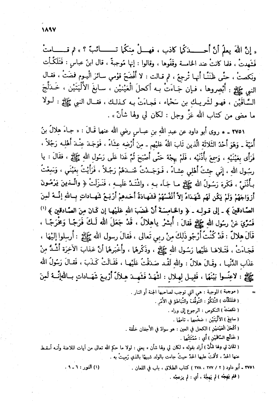 2751 - * روى أبو داود عن عبد الله بن عباس رضي الله عنهما قال: "جاء هلال بن أمية- وهو أحد الثلاثة الذين تاب الله عليهم - أرضه عشاءً، فوجد عند أهله رجلاً، فرأى بعينيه، وسمع بأذنيه، فلم يهجه حتى أصبح ثم غدا على رسول الله صلى الله عليه وسلم، فقال: يا رسول الله، إني جئت أهلي عشاء، فوجدت عندهم رجلاً، فرأيت بعيني، وسمعت بأذني، فكره رسول الله صلى الله عليه وسلم ما جاء به، واشتد عليه، فنزلت {وَالَّذِينَ يَرْمُونَ أَزْوَاجَهُمْ وَلَمْ يَكُنْ لَهُمْ شُهَدَاءُ إِلَّا أَنْفُسُهُمْ فَشَهَادَةُ أَحَدِهِمْ أَرْبَعُ شَهَادَاتٍ بِاللَّهِ إِنَّهُ لَمِنَ الصَّادِقِينَ} -إلى قوله- {وَالْخَامِسَةَ أَنَّ غَضَبَ اللَّهِ عَلَيْهَا إِنْ كَانَ مِنَ الصَّادِقِينَ} (1) فسُرِّي عن رسول الله صلى الله عليه وسلم فقال: أبشرْ يا هلالُ، قد جعل الله لك فرجاً ومخرجاً، قال هلالٌ: قد كنت أرجو ذلك من ربي تعالى، فقال رسول الله صلى الله عليه وسلم: أرسلوا إليها، فجاءت، فتلاها عليهما رسول الله صلى الله عليه وسلم، وذكرهما، وأخبرهما أن عذاب الآخرة أشدُّ من عذاب الدنيا، وقال هلالٌ: والله لقد صدقتُ عليها، فقالت كذب، فقال رسول الله صلى الله عليه وسلم: لاعنوا بينهما، فقيل لهلالٍ: اشهد فشهد هلالٌ أربع شهادات بالله إنه لمن