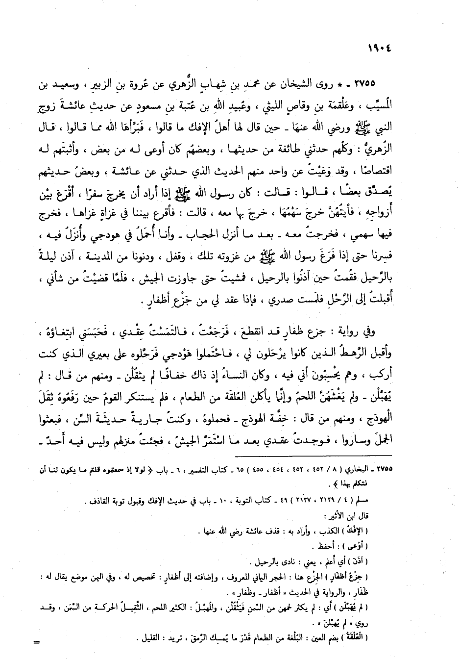 2755 - * روى الشيخان عن محمد بن شهاب الزهري عن عُروة بن الزبير، وسعيد بن المسيب، وعلقمة بن وقاص الليثي، وعبيد الله بن عتبة بن مسعود عن حديث عائشة زوج النبي صلى الله عليه وسلم ورضي الله عنها - حين قال لها أهل الإفك ما قالوا، فبرأها الله مما قالوا، قال الزهري: وكلهم حدثني طائفة من حديثها، وبعضهم كان أوعى له من بعض، وأثبتهم له اقتصاصاً، وقد وعيت عن واحد منهم الحديث الذي حدثني عن عائشة، وبعض حديثهم يُصدق بعضاً، قالوا: قالت: كان رسول الله صلى الله عليه وسلم إذا أراد أن يخرج سفراً، أقرع بين أزواجه، فأيتهن خرج سهمها، خرج بها معه، قالت: فأقرع بيننا في غزاةٍ غزاها، فخرج فيها سهمي، فخرجت معه - بعد ما أنزل الحجاب - وأنا أُحمل في هودجي وأنزل فيه، فسرنا حتى إذا فرغ رسول الله صلى الله عليه وسلم من غزوته تلك، وقفل، ودنونا من المدينة، آذن ليلة بالرحيل فقمت حين آذنوا بالرحيل، فمشيت حتى جاوزت الجيش، فلما قضيتُ من شأني، أقبلت إلى الرحْلِ فلمست صدري، فإذا عقد لي من جزع أظفارٍ.